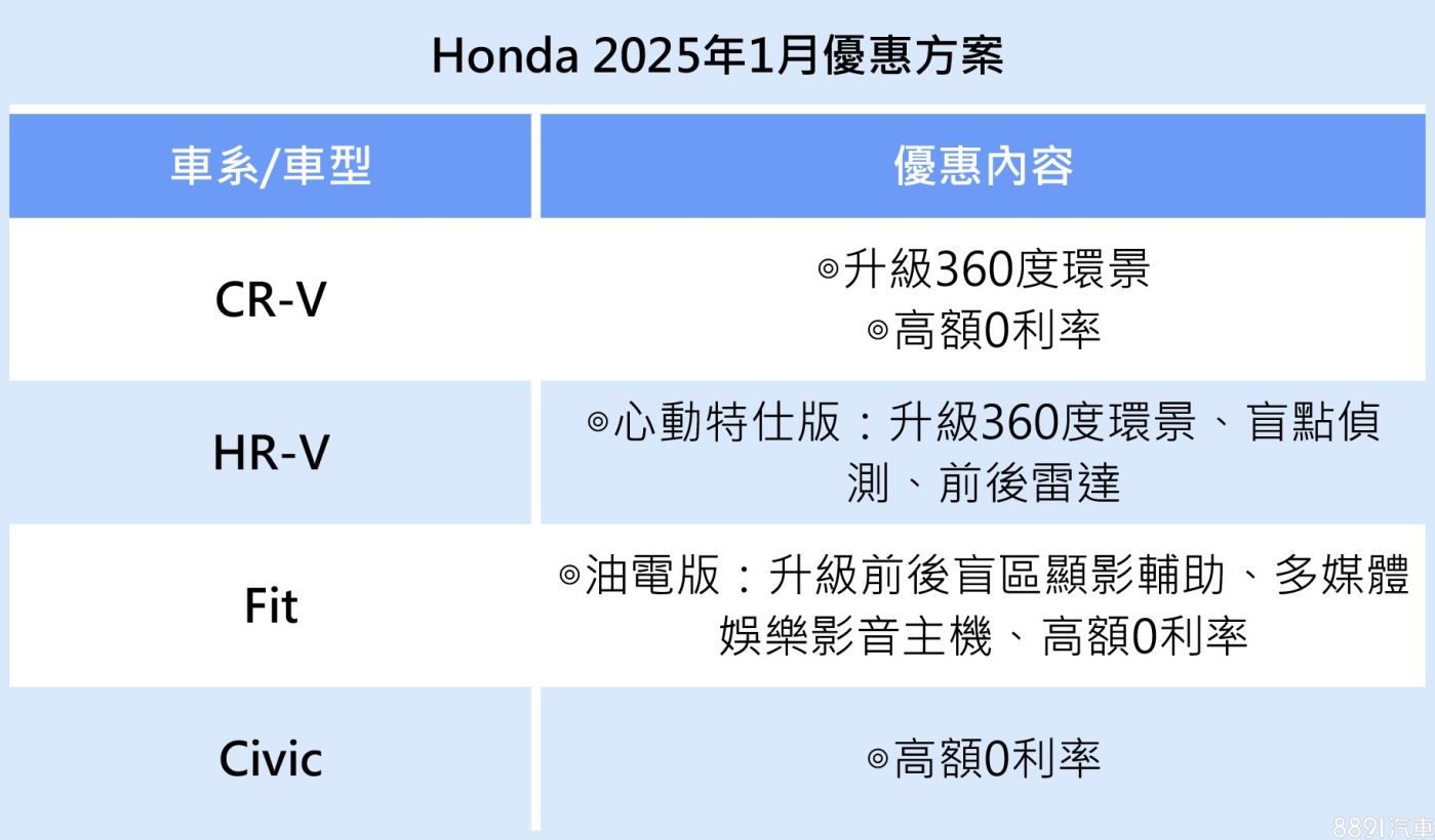 HR-V持續提供心動特仕版,升級360度環景、盲點偵測、前後雷達等;本月入主CR-V同樣可享360度環景升級;Fit油電版則無料追加前後盲區顯影輔助、多媒體娛樂影音主機。