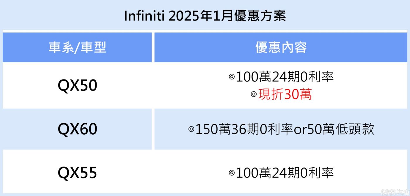 至1/24止,Infiniti QX50祭出最高30萬現金優惠,而QX60也可享高額分期0利率,或50萬輕鬆入主方案,至於QX55則適用100萬24期0利率專案。