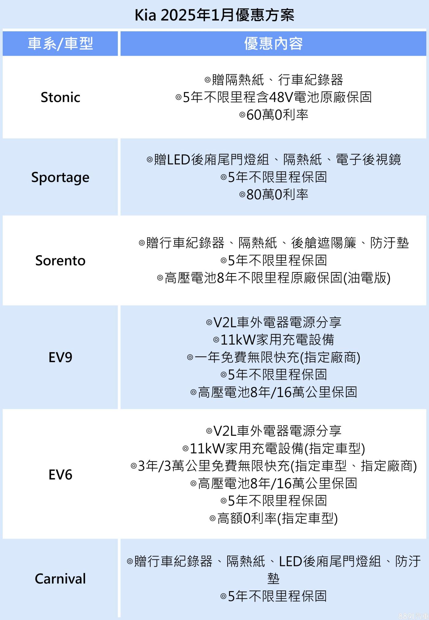 1月入主Kia指定車款,均可免費升級實用部件,如Sportage,買就送LED後廂尾門燈組、隔熱紙、電子後視鏡等,同步享5年不限里程保固、80萬0利率等方案。純電車款如EV6、EV9,入主指定車型就送V2L車外電器電源分享、11kW家用充電設備、指定廠商一年免費無限快充等,並適用5年不限里程保固,以及高壓電池8年/16萬公里保固。