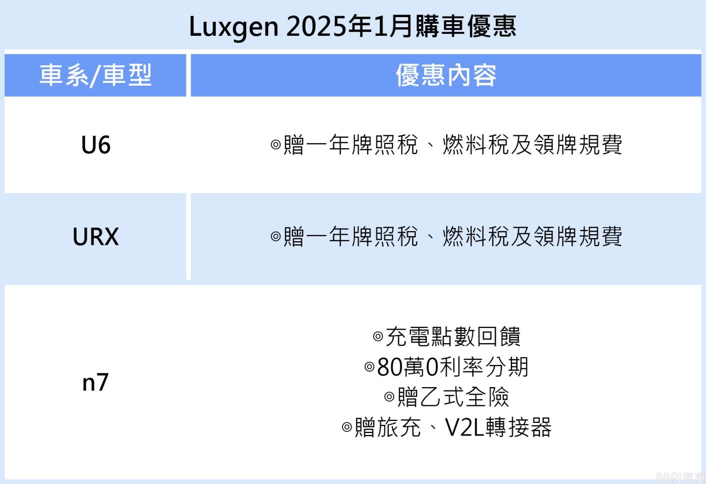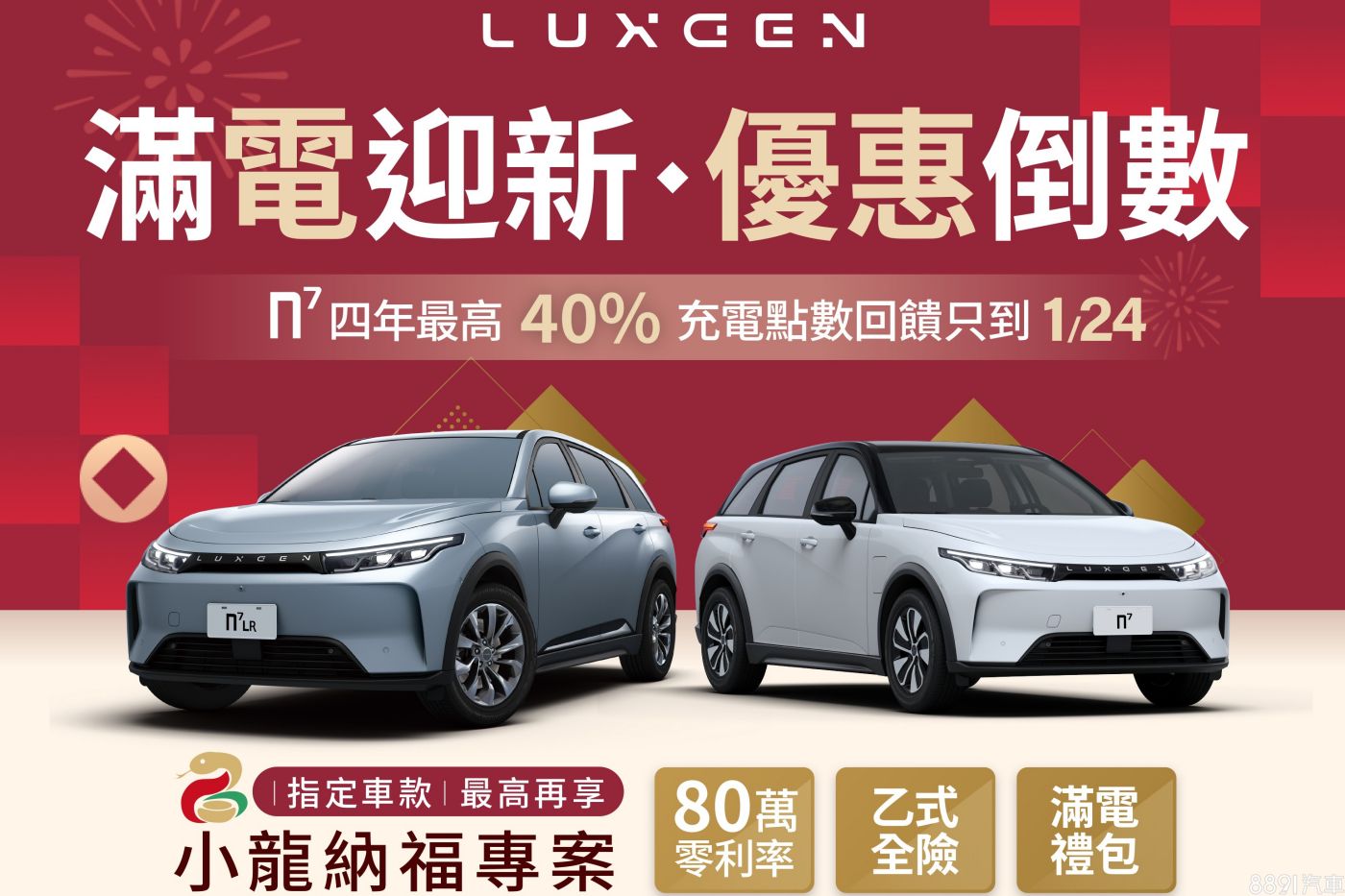 只要在2025/1/24前入主n7,即可獲得「充電點數回饋」,指定車型除了有80萬零利率分期專案,再送乙式全險,以及實用的旅行式行動充電器、V2L車外供電轉接器!購買U6、URX全車系,也能享有全年領牌費,包含一年牌照稅、燃料費及領牌規費(不含選號費)。