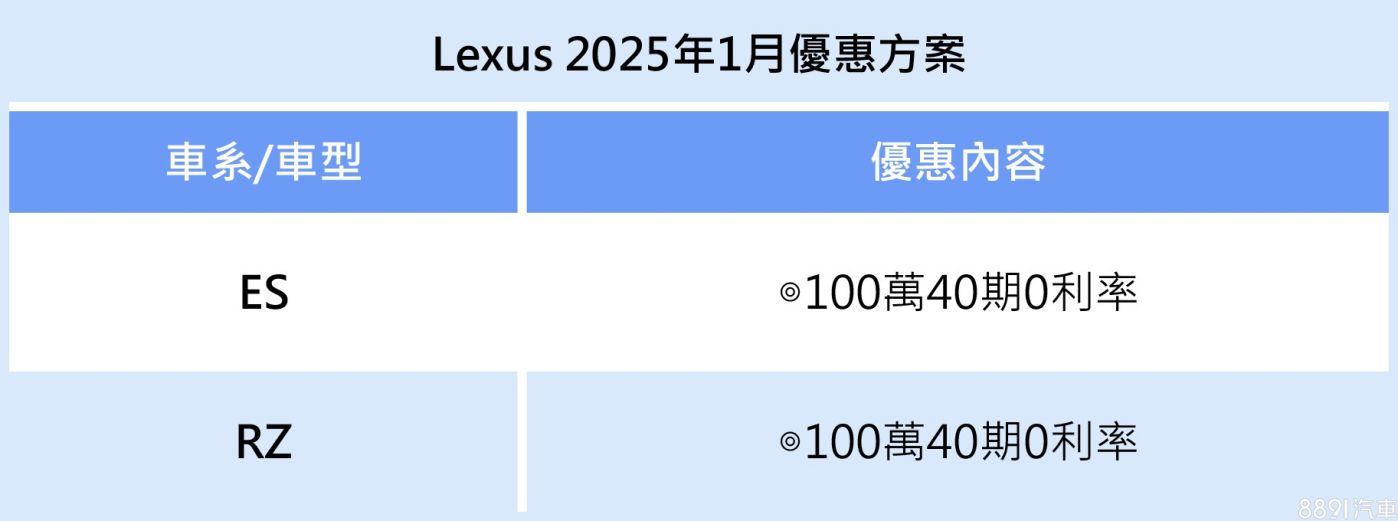 Lexus針對ES和RZ推出貸款優惠,提供100萬40期0利率分期專案。其他車系可適用「智選購車專案」,主打低頭款、低月付輕鬆入主,給予消費者更多樣且彈性的付款方式。
