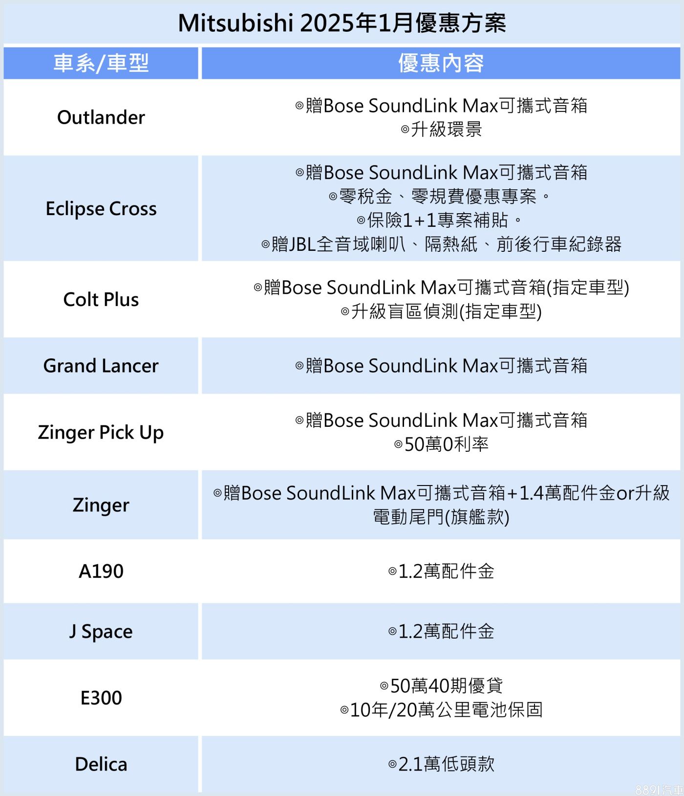 本月入主Zinger和J Space,都能享有配件金,前者1.4萬、後者1.2萬,Zinger指定車型還能選擇升級電動尾門。凡購買Outlander、Eclipse Cross、Colt Plus、Grand Lancer、Zinger Pick Up與Zinger指定車型並完成領牌,均贈Bose SoundLink Max可攜式音箱。此外,依車型不同,另有零稅金、零規費、配備升級、配件金等優惠。