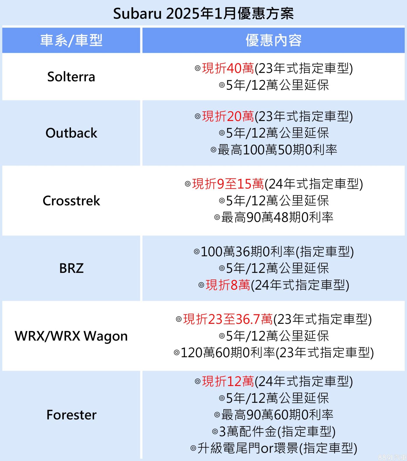 即日起至1月24日止,入主速霸陸指定車型都可享最實惠的現金折價,降幅8至40萬不等,並搭配延長保固,以「台柱」Forester為例,除了指定款能現折12萬,也有贈3萬配件金、配備升級的選項。
