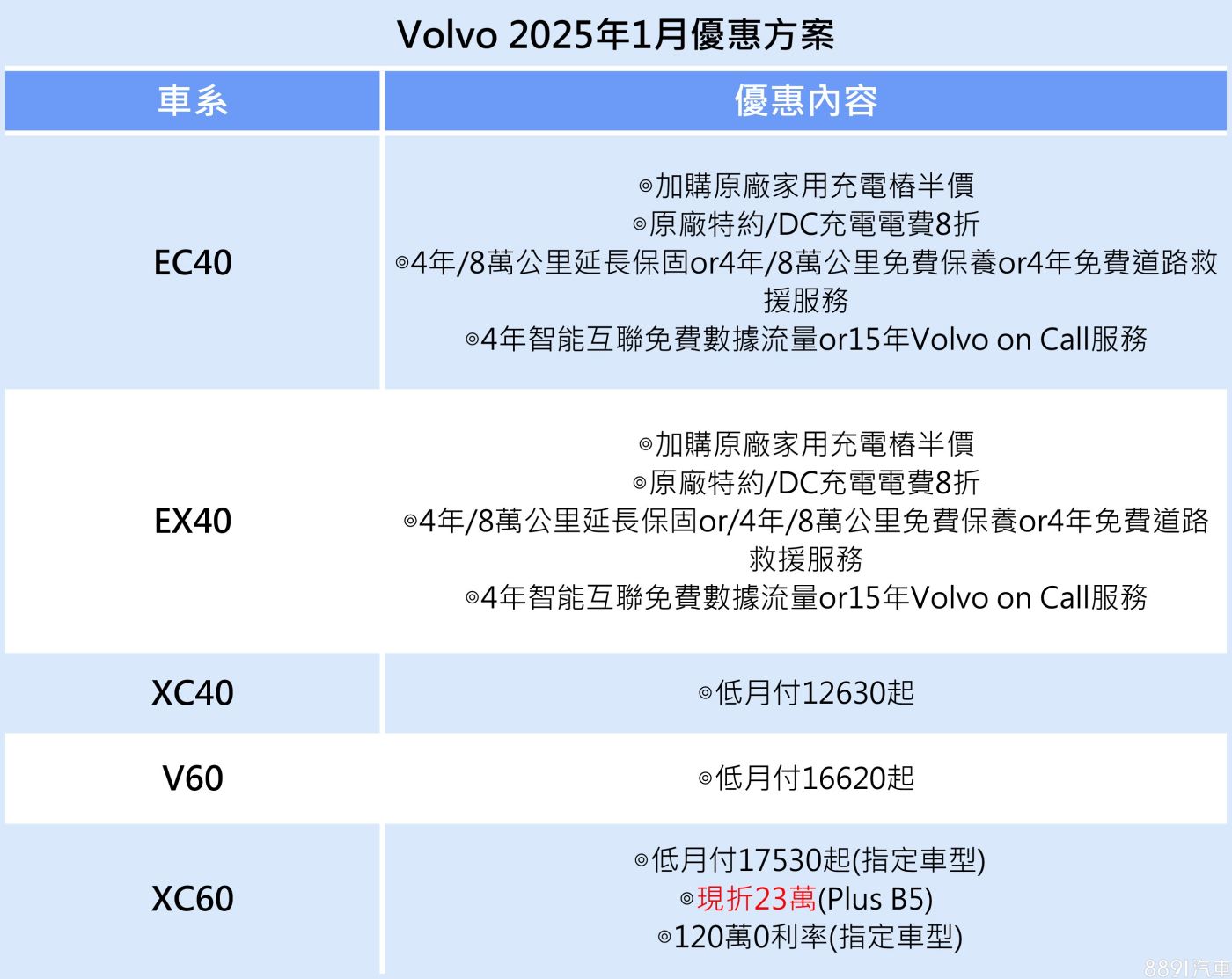 隨著新年式陸續上線,2025年1月Volvo優惠少了些過往提供的折價方案,多主打低月付或優貸,舉例來說,銷售台柱之一的XC40,低月付12630起就能購入,此外,XC60 B5 Plus是唯一有現金折扣的選項,便宜了23萬。純電小休旅EC40和EX40,均祭出入主就享原廠家用充電樁半價、原廠及特約DC充電電費8折、延長保固、Volvo on Call服務等優惠。