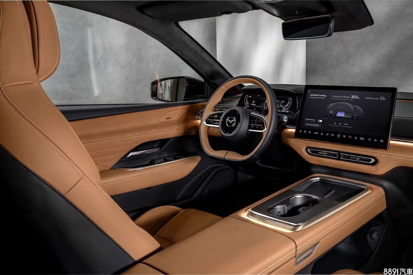 Mazda6e內裝與EZ-6也如出一轍,採用水平線條鋪陳、高聳的中船設計,且沒有太多傳統物理按鍵。中控台配備一具14.6吋螢幕,整合空調、座椅加熱、氣氛燈調整,並具備觸控、聲控、手勢控制等多元操作方式。
