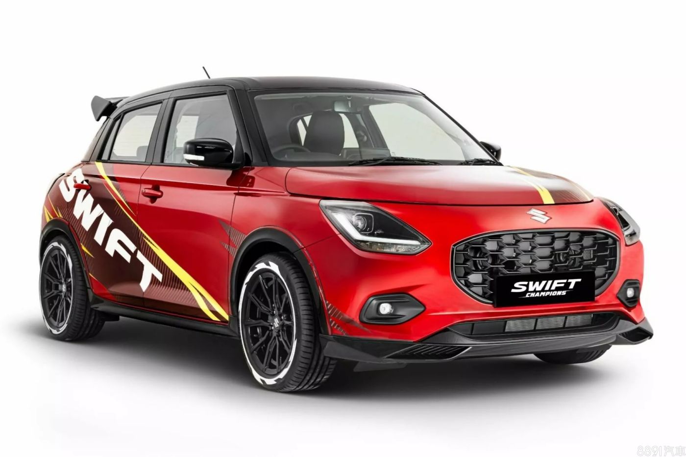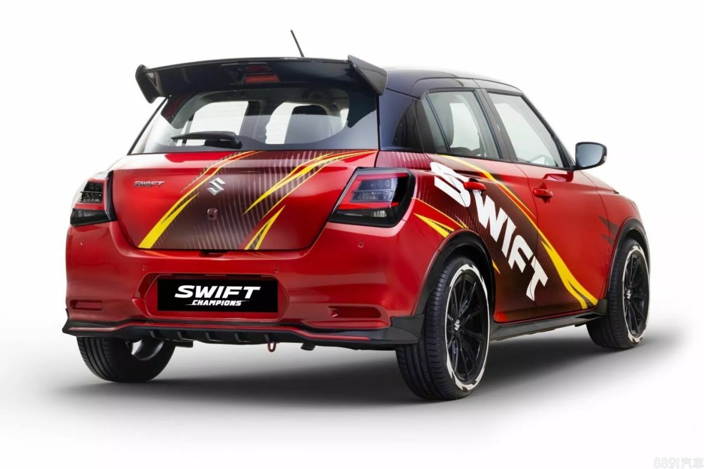 雖然原廠遲遲沒有發表新一代Swift Sport,但或許眼前這輛「Swift Champions」概念車可以先拿來做市調!以一身紅車色為主軸,搭配有卡夢紋路及漸層色的車貼,就連輪胎也有特殊貼紙,熱血指數加分不少!