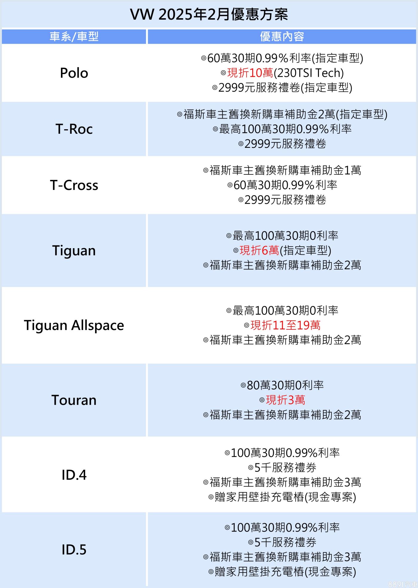 若原先就是品牌車主,還能享舊換新購車金,依車型不同,補助金最高3萬,而純電的ID.4、ID.5,則另有現金專案,贈家用壁掛充電樁,詳情可洽各地展間或官網查詢。