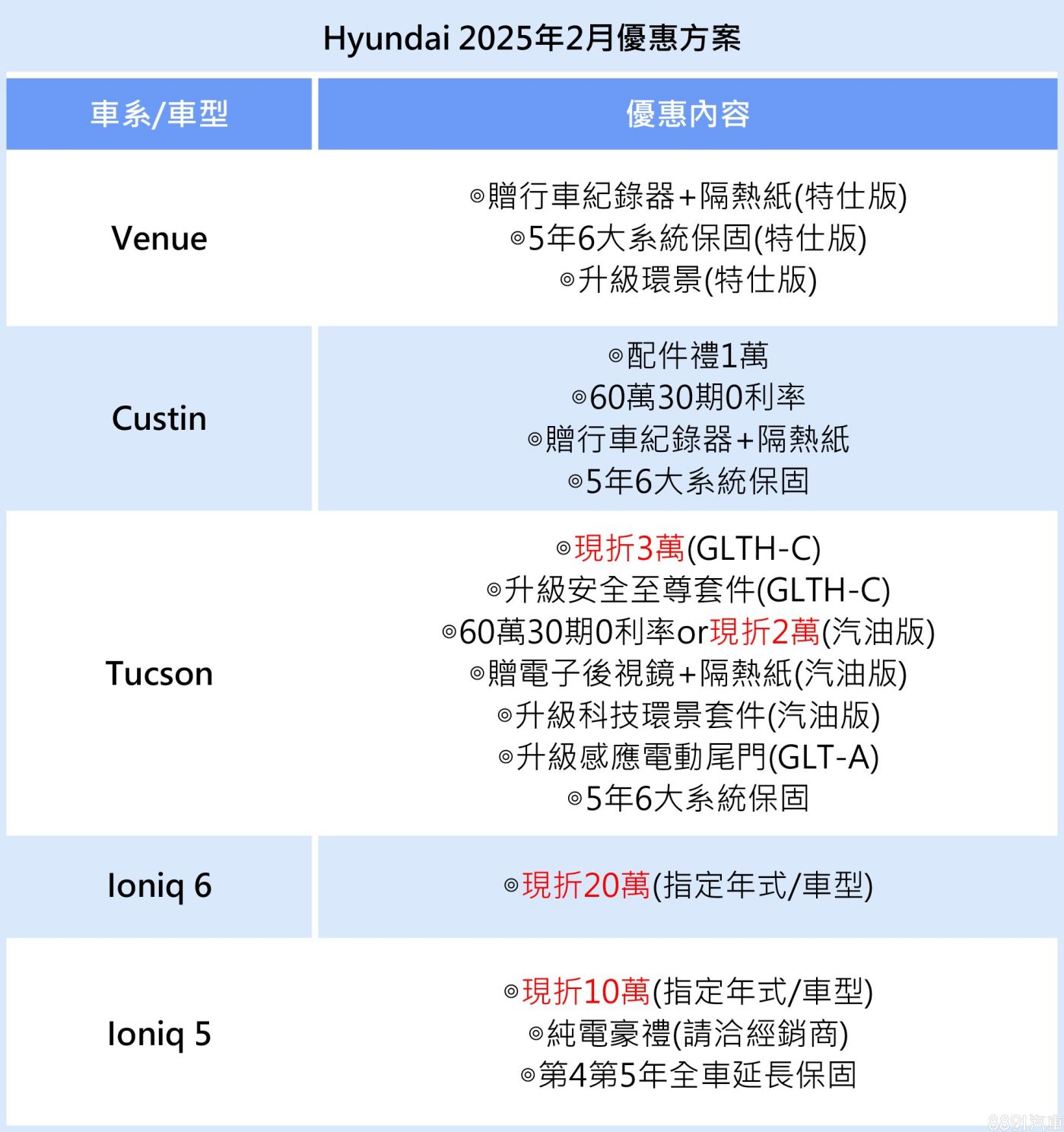 國產車系指定車型除了入主就享5年6大系統保固,Custin再加贈配件禮1萬、行車紀錄器、隔熱紙等,至於銷售台柱Tucson,GLTH-C車型可現折3萬,並升級安全至尊套件,包含原廠電子後視鏡、抬頭顯示器、隔熱紙、LED門檻飾板、金屬踏板等;汽油版本則能免費升級科技環景套件,整合360度環景、前雷達等配備。
