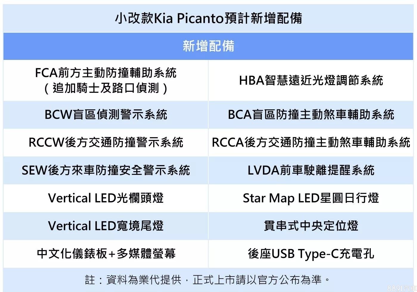 按先前業代提供資訊,小改Picanto將提供3車型,強調動感氣息的GT-line版本也會導入,儀錶+多媒體將採用中文化介面,重點放在新增不少駕駛輔助系統,除了原有AEB追加騎士及路口偵測外,也會有盲區偵測警示、盲區防撞主動煞車輔助、後方交通防撞警示、後方交通防撞主動煞車輔助、前車駛離提醒、遠近光燈主動調節等等,依舊主打「最安全小車」的產品賣點!