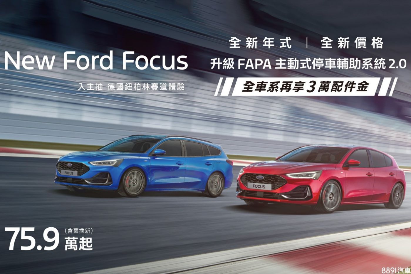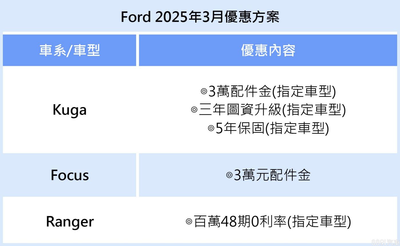Ford於3月春滿花開之際推出各式超值購車優惠方案,即日起至2025年3月31日止,入主全新年式Focus,除加贈3萬元配件金,於活動期間 再抽總價值9.3萬元的德國紐柏林賽道體驗行程。