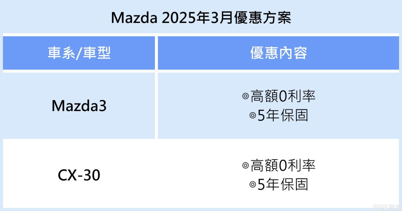 而台灣馬自達也同步推出限時購車優惠,凡於3月入主Mazda3、CX-30車系,均可享有購車高額0利率與5年原廠保固。