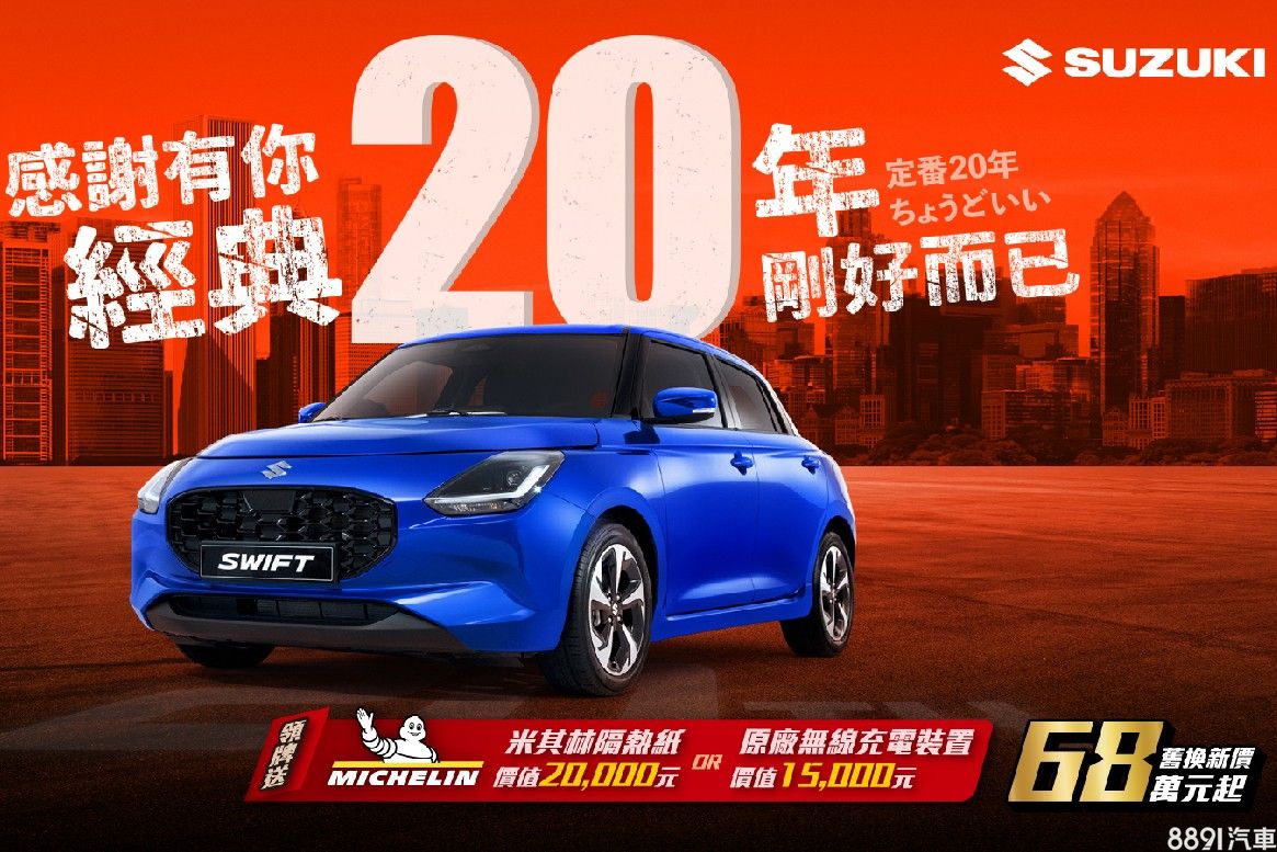 為了感謝台灣消費者20年來對Swift的好評與支持,台灣Suzuki特別準備「20周年專案」,凡於即日起至2025/3/31,來店賞車就送乖乖聯名包,試乘加贈乖乖聯名御守,訂車並完成領牌還能免費升級手機無線充電裝置,或是米其林隔熱紙。