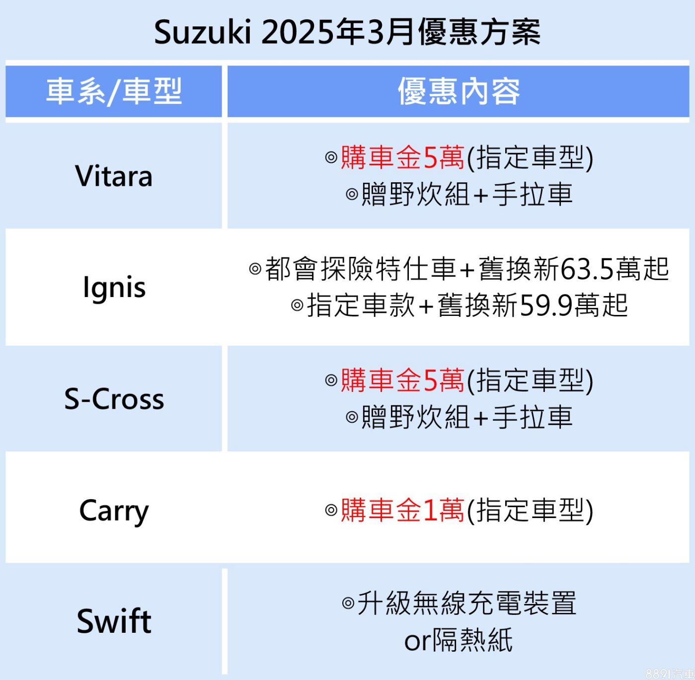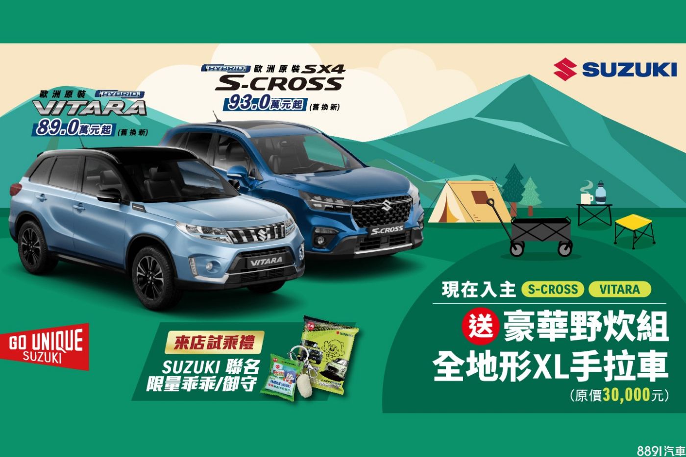 另購買Vitara、S-Cross,則有5萬購車金回饋,加贈野炊組+手拉車,詳情可至I全台各大經銷據點,體驗車款特色。