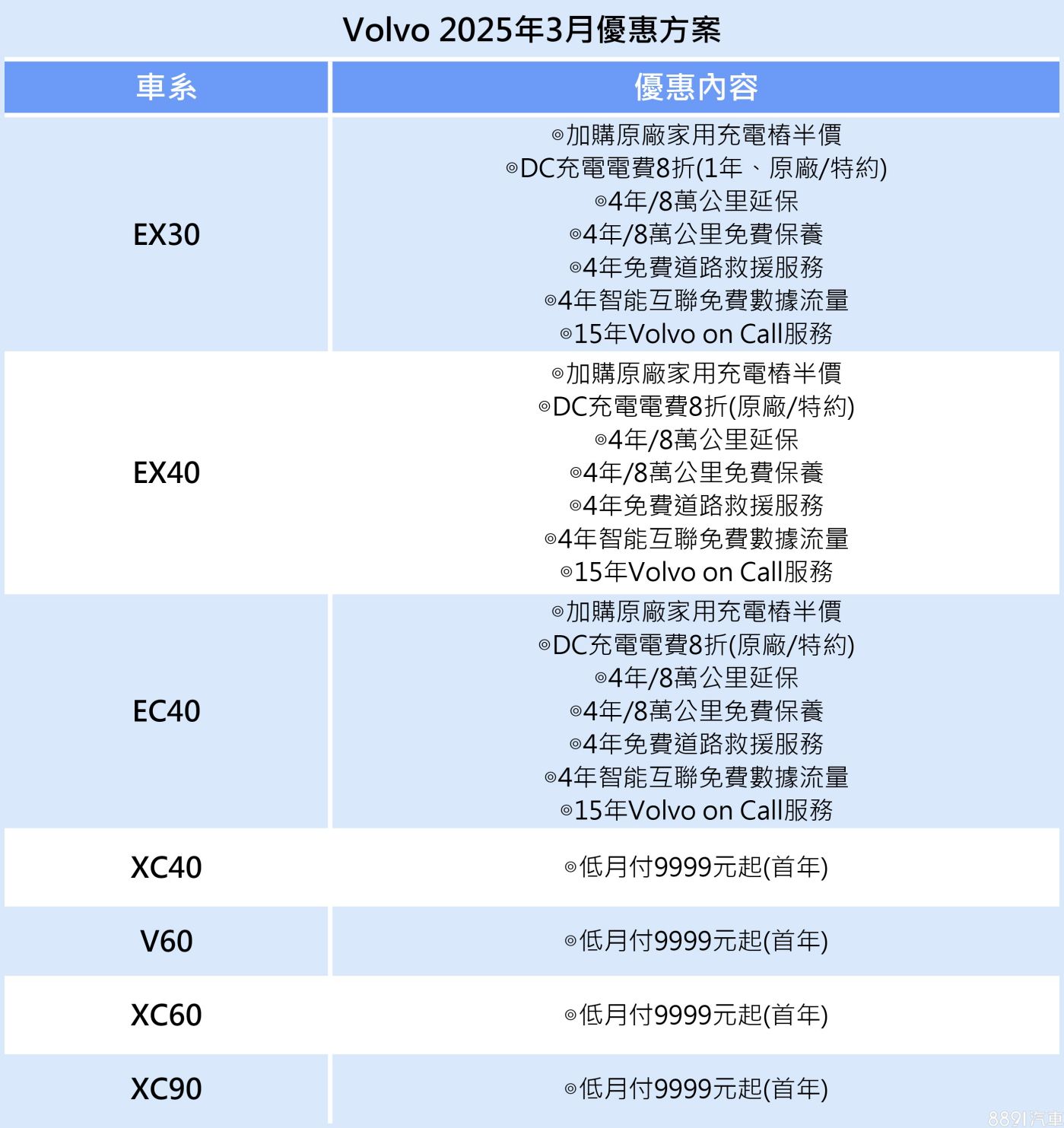 純電小休旅EC40、EX40,以及甫上市的EX30,均祭出入主就享原廠家用充電樁半價、原廠及特約DC充電電費8折、延長保固、Volvo on Call服務等優惠,詳情可洽展間或官網查詢。