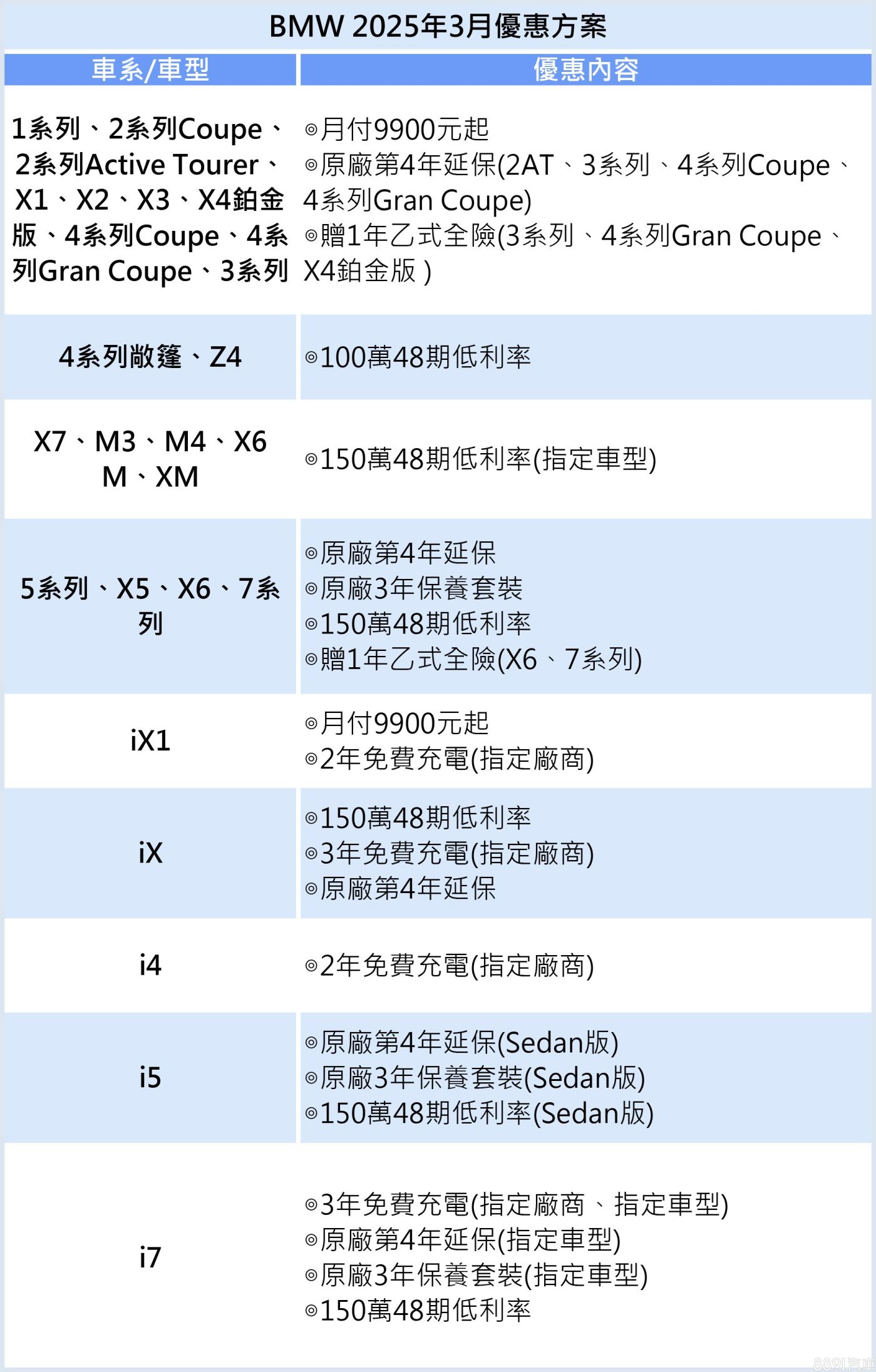 另BMW三月購車專案,針對旗下純電車款均推出不同優惠內容,本月完成交車領牌,指定車型除了可享高額低利率外,再加贈最高3年U-Power不限里程免費充電,部分車型再享原廠保養套餐及第4年延長保固。