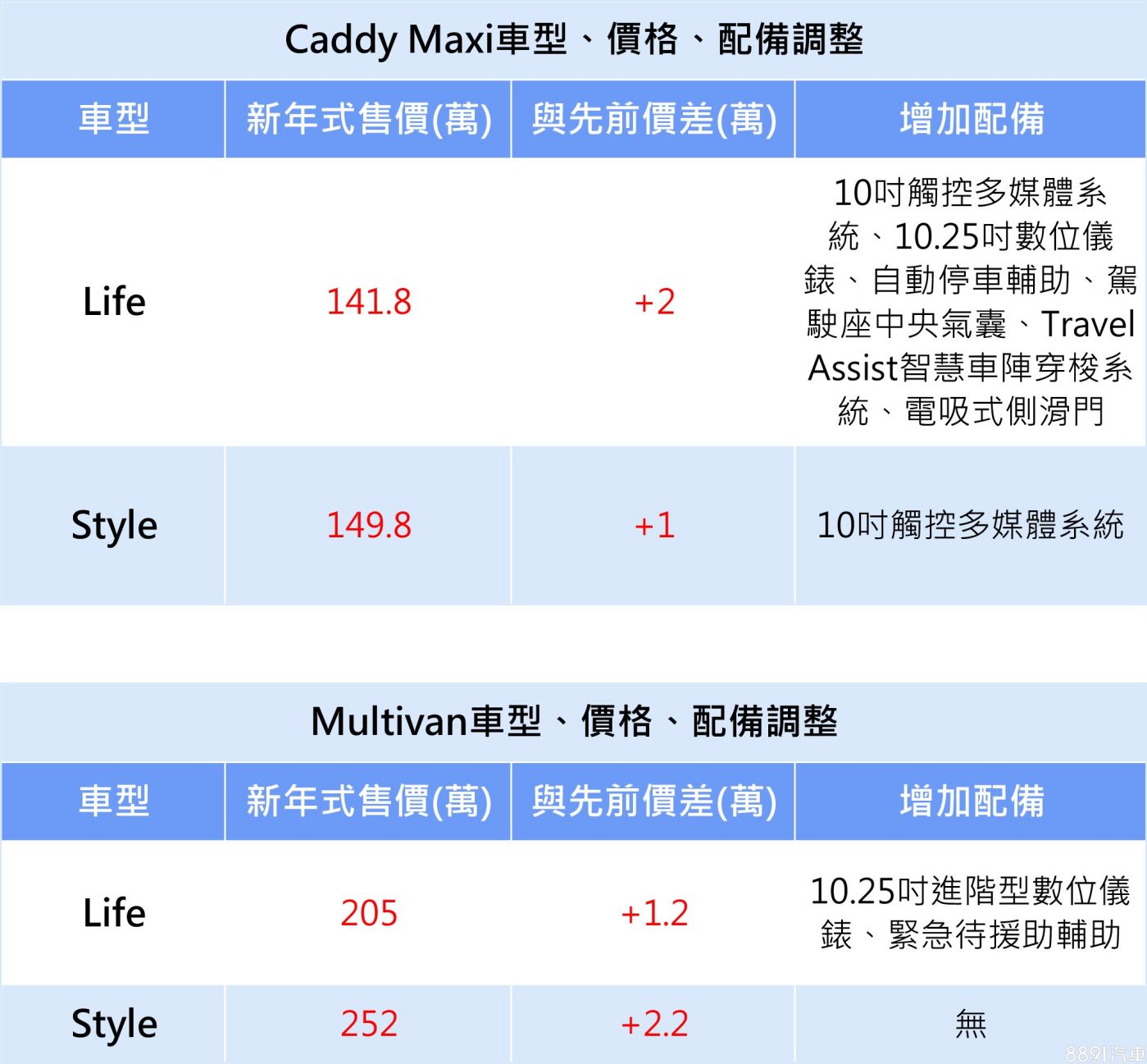 2025年式Caddy Maxi持續提供Life、Style雙車型,分別開出141.8、149.8的售價,較過往各調漲2、1萬元,但全車系升級10吋觸控多媒體系統,入門的Life版本更是加好加滿,另追加10.25吋數位儀錶、自動停車輔助、駕駛座中央氣囊、Travel Assist智慧車陣穿梭系統、電吸式側滑門等配備。