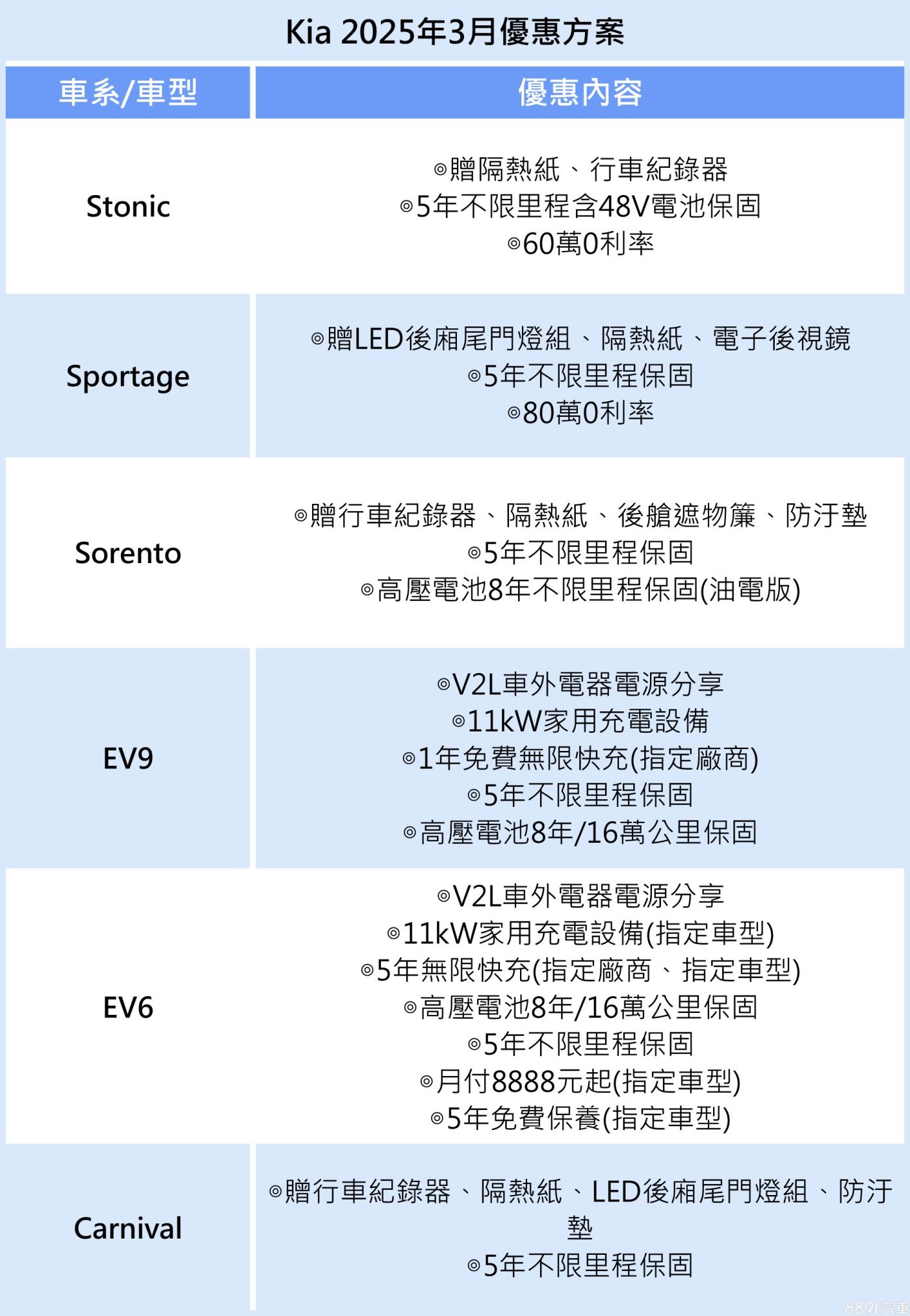 3月入主指定車款,均可免費升級實用部件,如Sportage,買就送LED後廂尾門燈組、隔熱紙、電子後視鏡等,同步享5年不限里程保固、80萬0利率等方案。