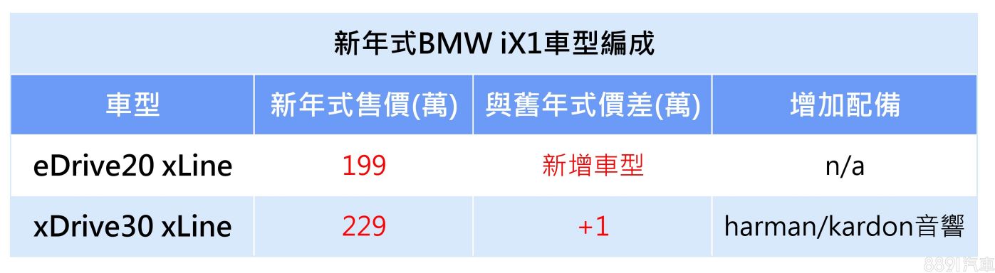 順帶一題,為了加強產品區隔,車系燃油頂規「X1 sDrive20i xLine」和純電頂規「iX1 xDrive30 xLine」,均隨新年式升級標配12支揚聲器Harman/Kardon音響系統,售價也雙雙小漲1萬,前者開價217萬,後者定價則來到229萬元。