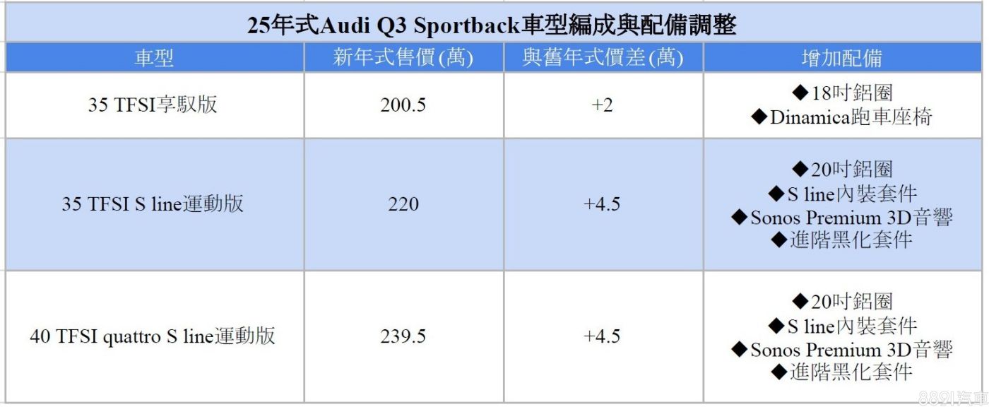 跑旅Q3 Sportback方面,中階、高階都漲4.5萬,除了升級20吋鋁圈、S lines內裝套件、Sonos音響外,還加碼「進階黑化套件」,包含四環廠徽、水箱護罩、後視鏡、保桿與窗框都塗黑處理,提升動感氛圍。