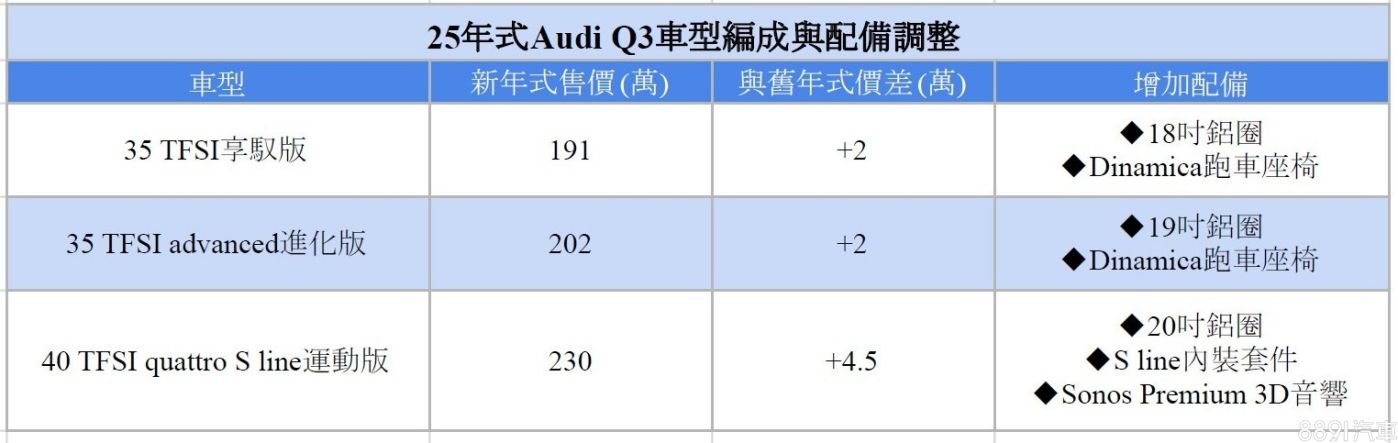 新年式Q3供應3車型,漲幅2~4.5萬,入門及中階主要是針對鋁圈加大,並換上Dinamica跑車化座椅,頂規40 TFSI quattro S line運動版 ,除了內外都有升級外,也換上Sonos音響系統。