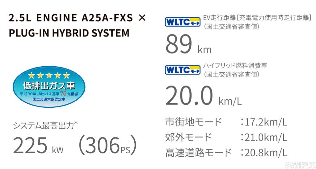 依日本WLTC測試標準,2.5升Hybrid車型平均油耗為20.3km/L,PHEV版本則為20.0km/L,並具備89km純電行駛里程。