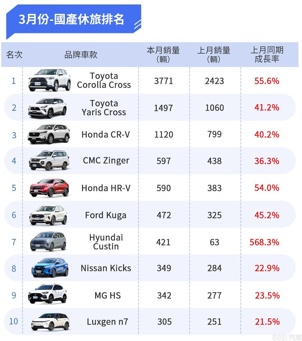 Corolla Cross本月交車3771輛、大漲55.6%,依舊國產休旅不敗王者,價格經濟實惠,加上汽油/油電雙動力擴大客群,都是CC穩居熱銷冠軍的主要原因;小老弟Yaris Cross也在CUV級距展現統治力,掛牌1497輛、上揚41.2%的成績也是夠殺。