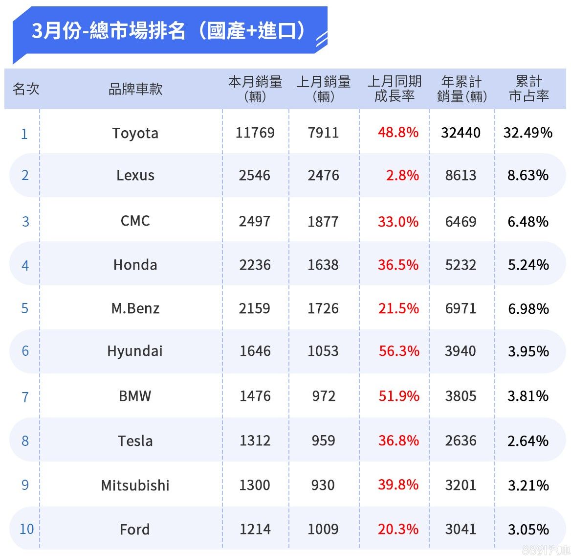 總市場冠亞軍不變,仍由和泰代理雙品牌把持,其中Toyota銷量成長48.8%,重回一萬台規模,中段名次開始出現變化,Honda與M.Benz互換排名,Hyundai與BMW成長超過5成也十足亮眼,相比之下Ford雖成長20%,但無奈競品表現更好,排名反倒退步了。