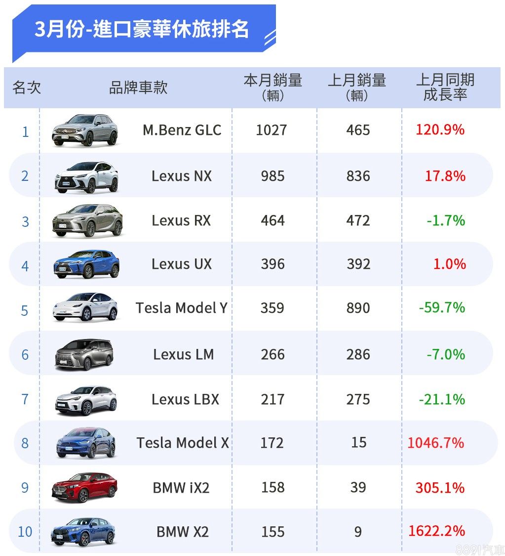 3月份豪華休旅排名大洗牌,賓士GLC牙起來賣,同比上月成長120%、交出1027台好成績,登上豪華休旅銷售冠軍,硬是把長期占據榜首的Lexus NX給擠下。雖然NX退位讓賢,但以整體品牌銷售來看,10名的榜單中佔據2、3、4、6、7名,品牌總量來看依舊是贏家。