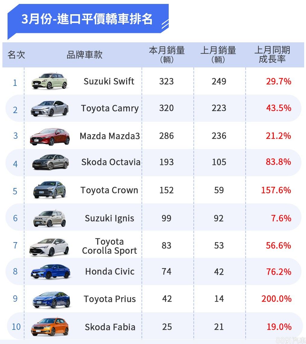 Toyota三月份在進口轎車部分也大有斬獲,Camry直接以43%成長擠下Mazda3,奪下亞軍位置,定位更高端的Crown,以及油電神主牌Prius都成長不少,兩款車都屬非主流級距,估計這波成長與船期、新車到港有關。