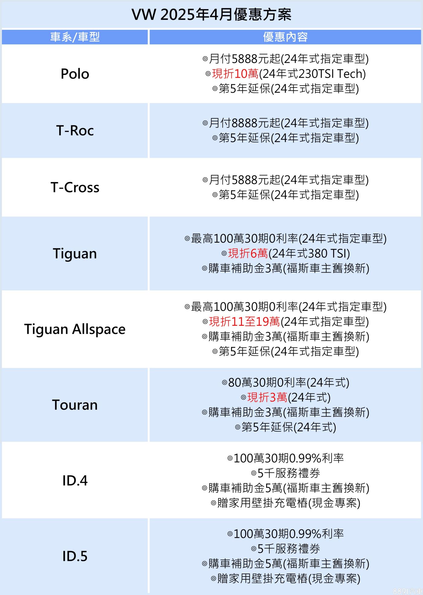 即日起至4月底,Touran推出春季優享價139.8萬元,同時可搭配30期零利率及第5年延長保固優惠。而Tiguan Allspace則能以149.8萬元起入主,指定車型享零利率高額30期分期付款專案,入主再享第5年延長保固,最高優惠金額超過20萬元。