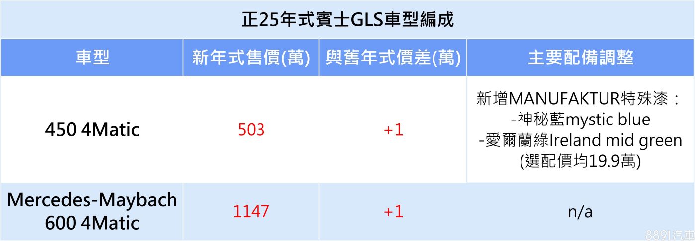 正25年式GLS小漲1萬,標準版同樣新增MANUFAKTUR特殊漆「神秘藍」與「愛爾蘭綠」兩款選配色,Maybach版本則是未做更動。