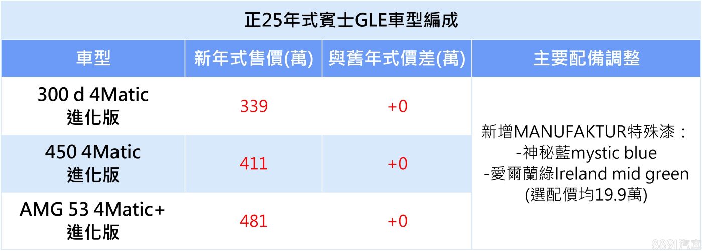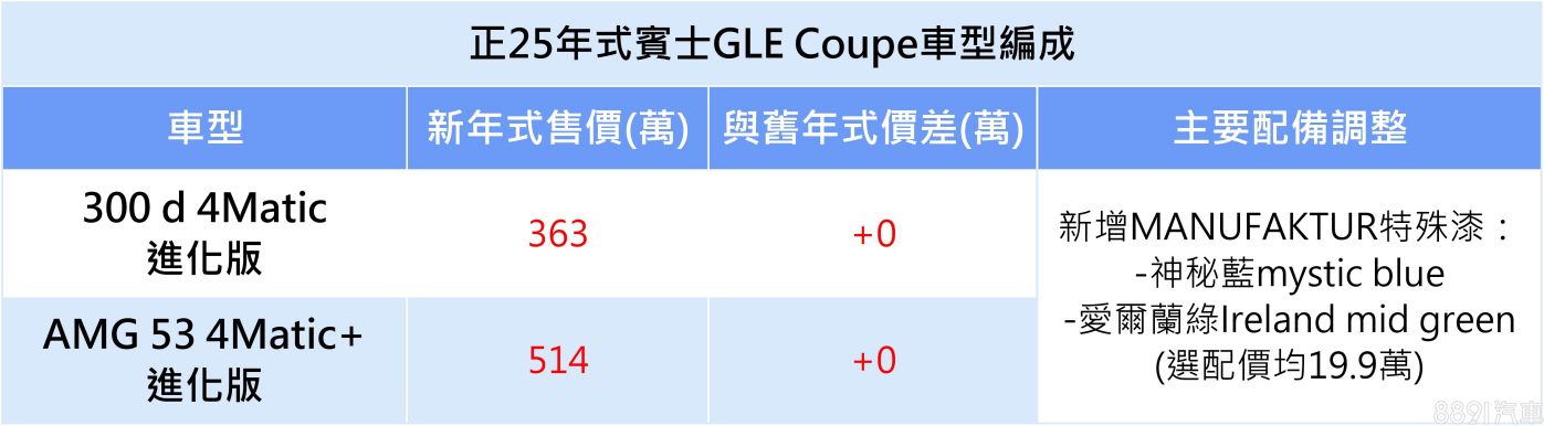 GLE及GLE Coupe正25年式,價格沒漲、車型維持不變,不過命名多了進化版來做區隔。兩車型均新增MANUFAKTUR特殊漆「神秘藍」與「愛爾蘭綠」兩種新車色,選配價均為19.9萬。