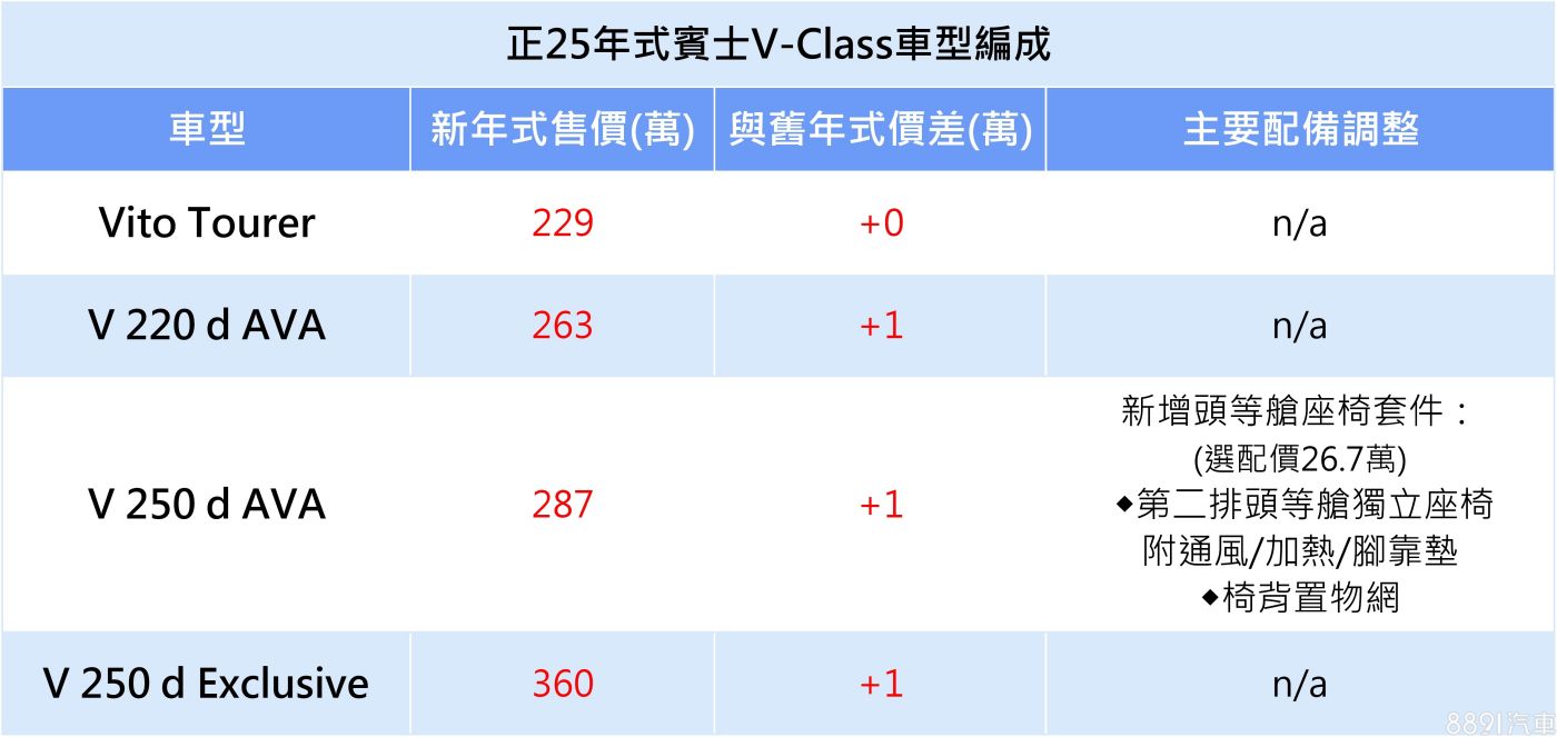 正25年式V-Class部分車型小漲1萬,並針對V 250 d AVA新增「頭等艙座椅套件」、選配價26.7萬,鎖定家用或商務需求的買家。第二排採用左右獨立座椅,附有電動調整、通風、加熱、腳靠墊等功能,能大幅提升乘客的舒適度與便利性。