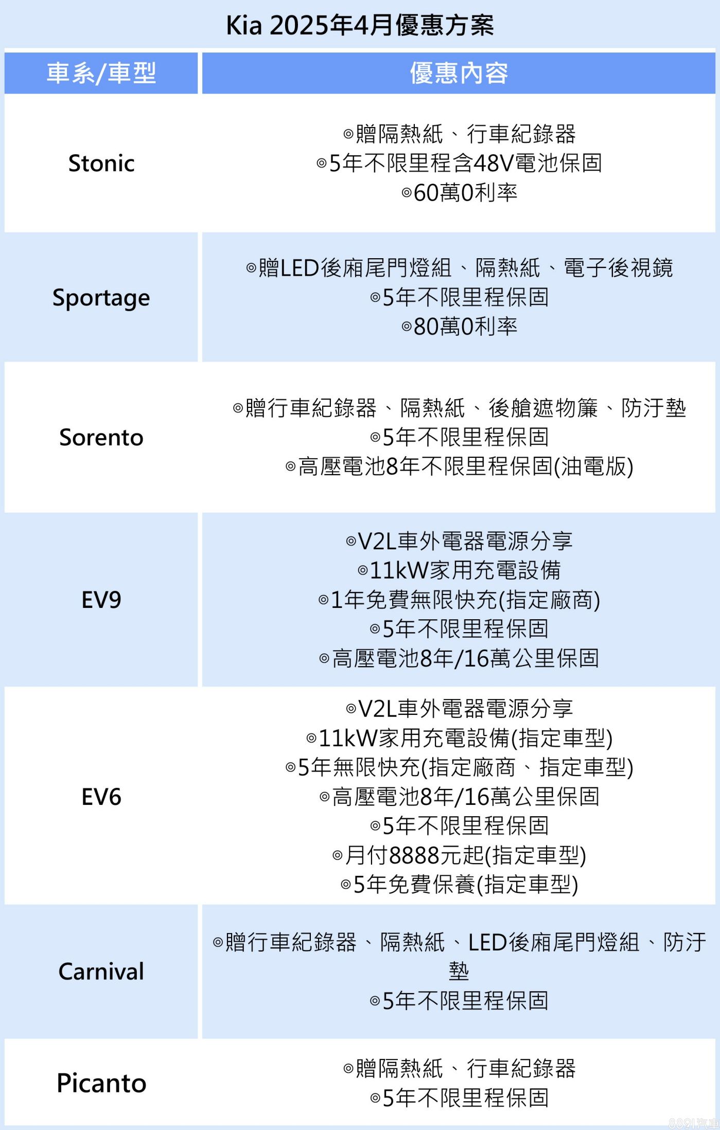 純電車款好康更多,以EV6為例,只要購買指定車型,除了贈送V2L車外電器電源分享、11kW家用充電設備,加碼享5年無限快充、不限里程保固和免費保養!另有月付8888元入主專屬方案,詳情可洽官網或各地展間查詢。