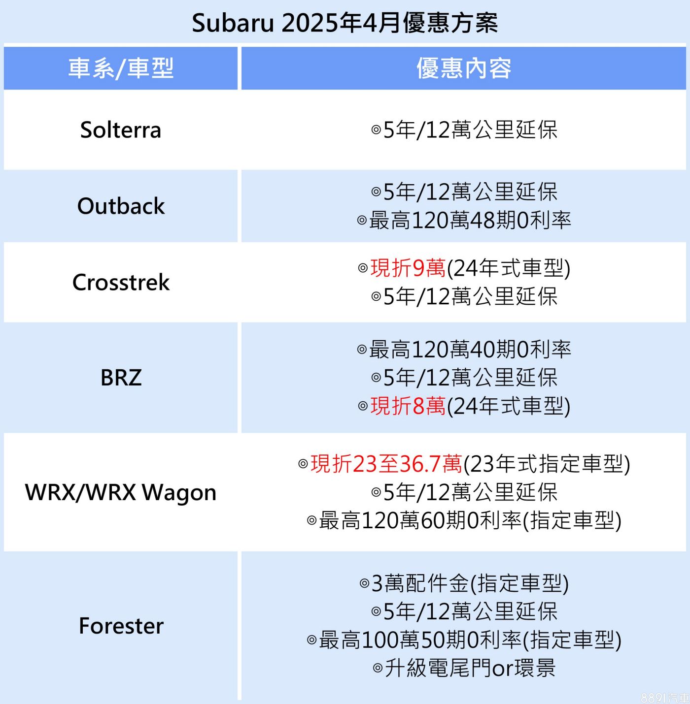 即日起至4/30止,入主速霸陸指定車型可享實惠的現金折價、0利率分期,或是配備升級等,首先在折價方面,依車型不同,降幅8至36.7萬不等,並可搭配5年/12萬延長保固。至於「台柱」Forester,除了最高100萬50期0利率,指定年式的2.0 i-L EyeSight,免費升級電動尾門與環景;2.0 i-S EyeSight則升級環景,以及現折1.5萬元。