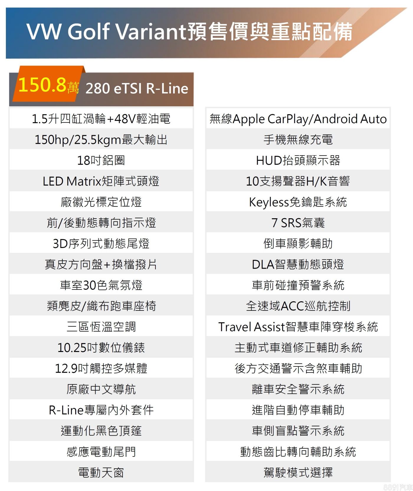台灣福斯今年新車由小改款Golf打頭陣,掀背與旅行車同步展開接單,首波供應「Golf 280 eTSI Style」與「Golf Variant 280 eTSI R-Line」各一車型,預售價分別為133.8萬與150.8萬,預售期間下訂,領牌再獲贈價值2.1萬的德國原廠行車紀錄器。