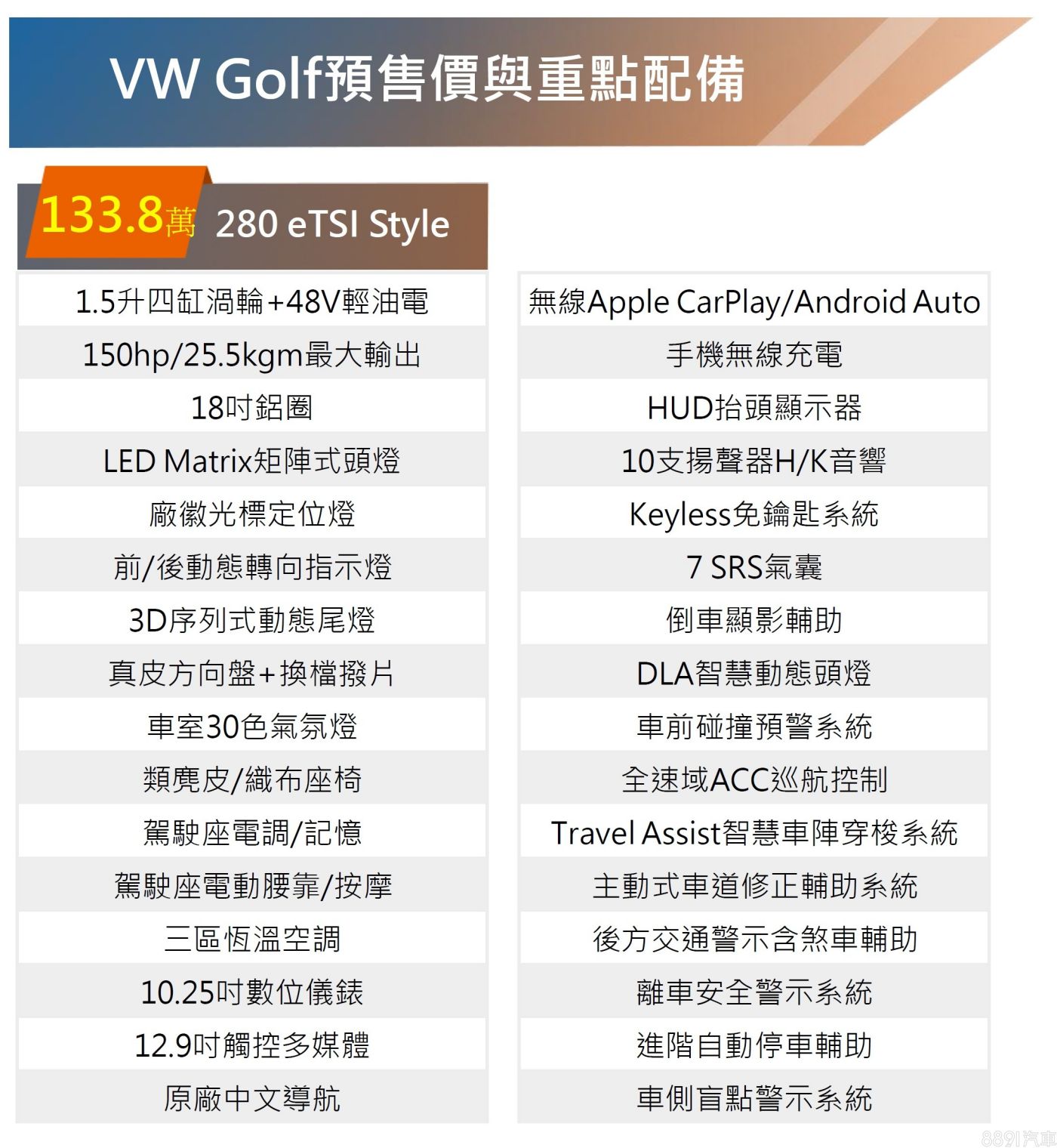 小改Golf 280 eTSI雙車型,沿用1.5升四缸渦輪+48V輕油電的組合,搭配7速DSG自手排變速箱,具備150hp/25.5kgm最大出力,並將18吋鋁圈、LED Matrix矩陣式頭燈、三區恆溫空調、10.25吋數位儀錶、12.9吋觸控多媒體、Harman Kardon音響、Level 2駕駛輔助、進階自動停車輔助列為全車系標配。