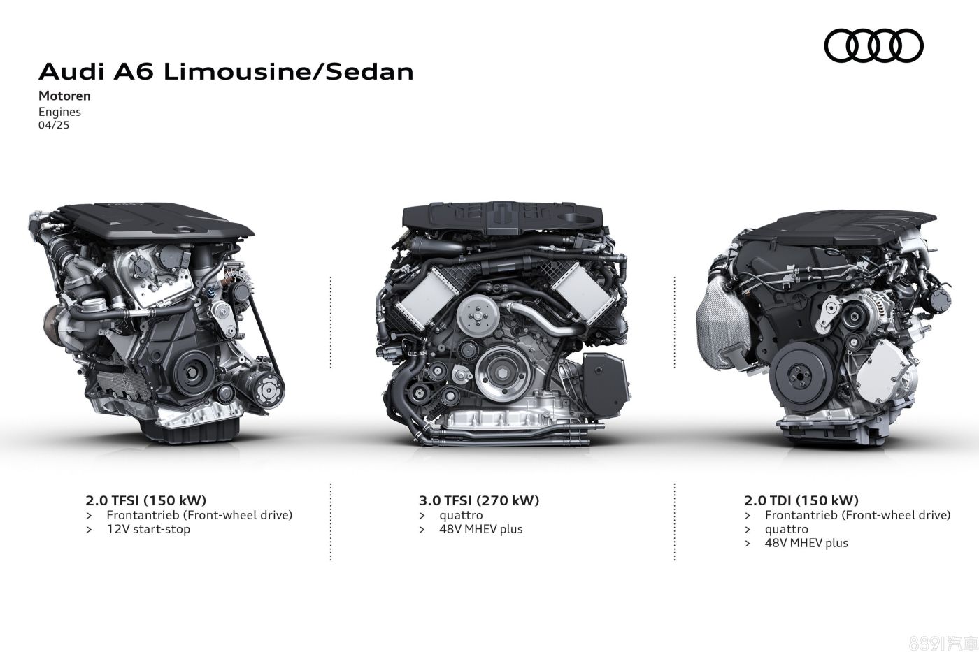A6 Sedan首波帶來1款柴油、2款汽油,國內應該會以後者為主。入門款搭載2.0升四缸渦輪,相比舊款加入VTG可變幾何渦輪,在低速時有助於降低渦輪遲滯,提升油門響應速度,可產生204hp/34.7kgm,搭配7速自手排變速箱,僅供前驅車型,8.2秒可完成0~100km/h加速。
