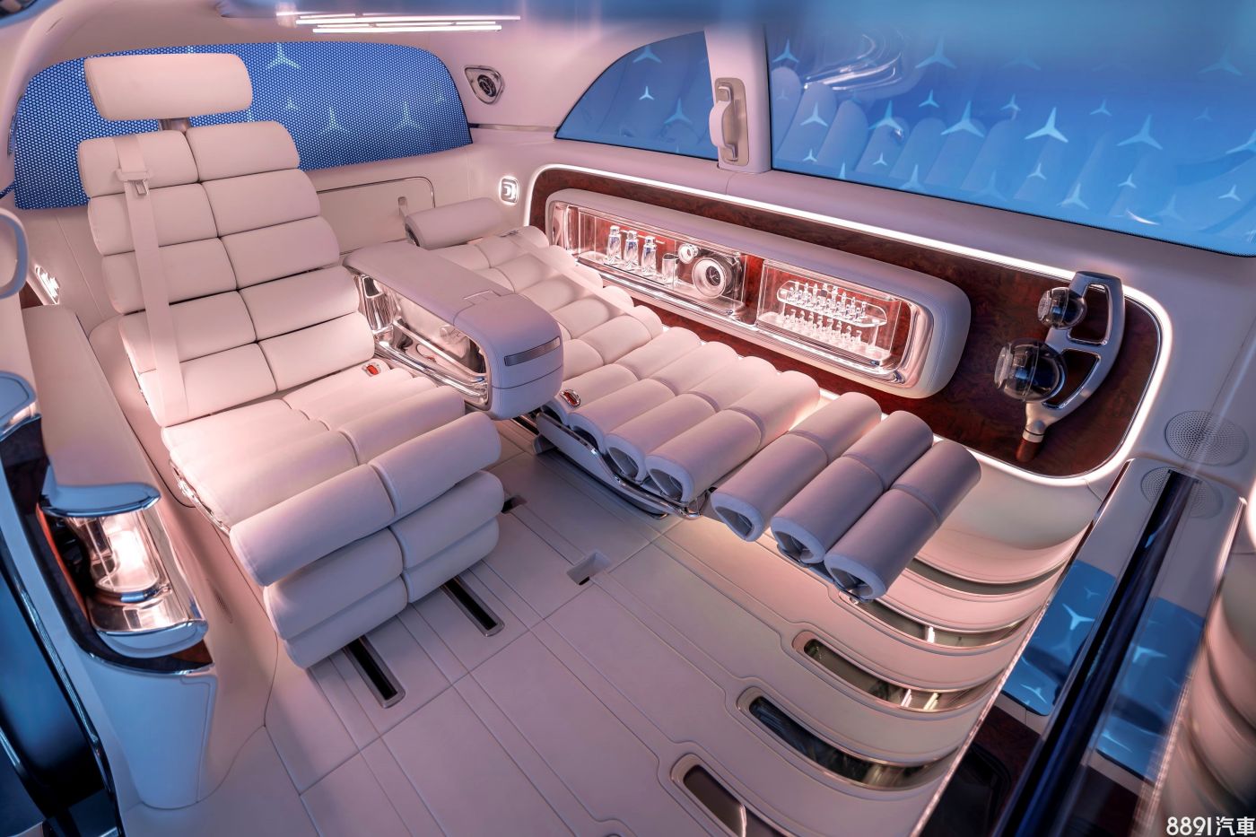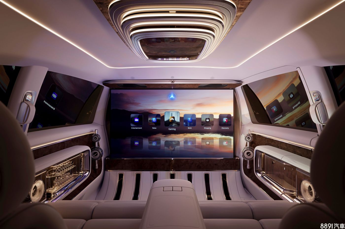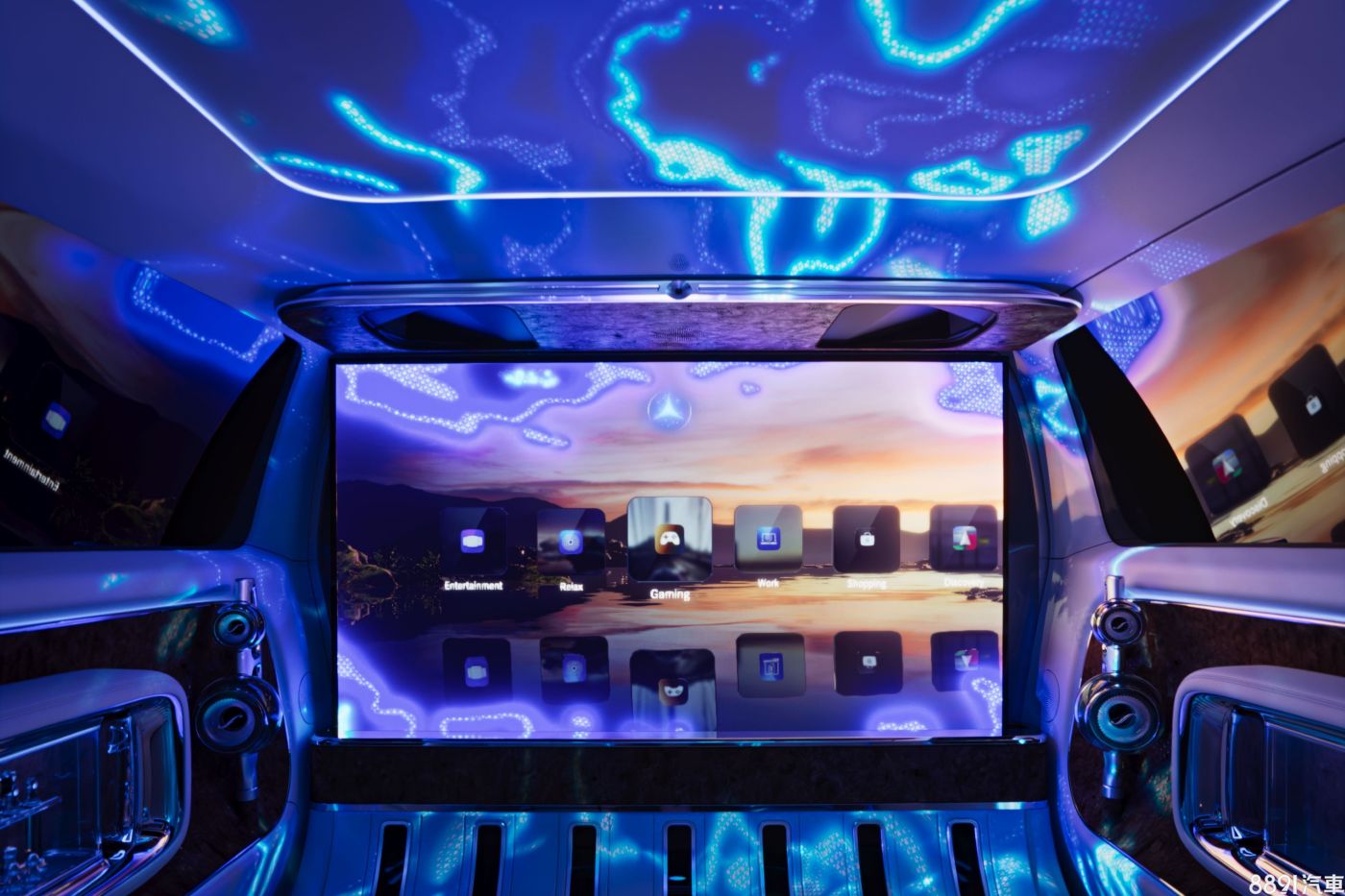 以「私人招待所」概念打造的乘客艙才是重點!車內使用奈米技術設計的智能玻璃屏,可隔開駕駛區與後座空間,能即時切換透明和霧白模式,提供高度隱私和遮陽效果;車側設有玻璃展示櫃,方便放置私人配件或遊戲搖桿等,中央扶手內置棋盤式摺疊桌板和操作觸控面板,既符合古典沒學又具實用性。