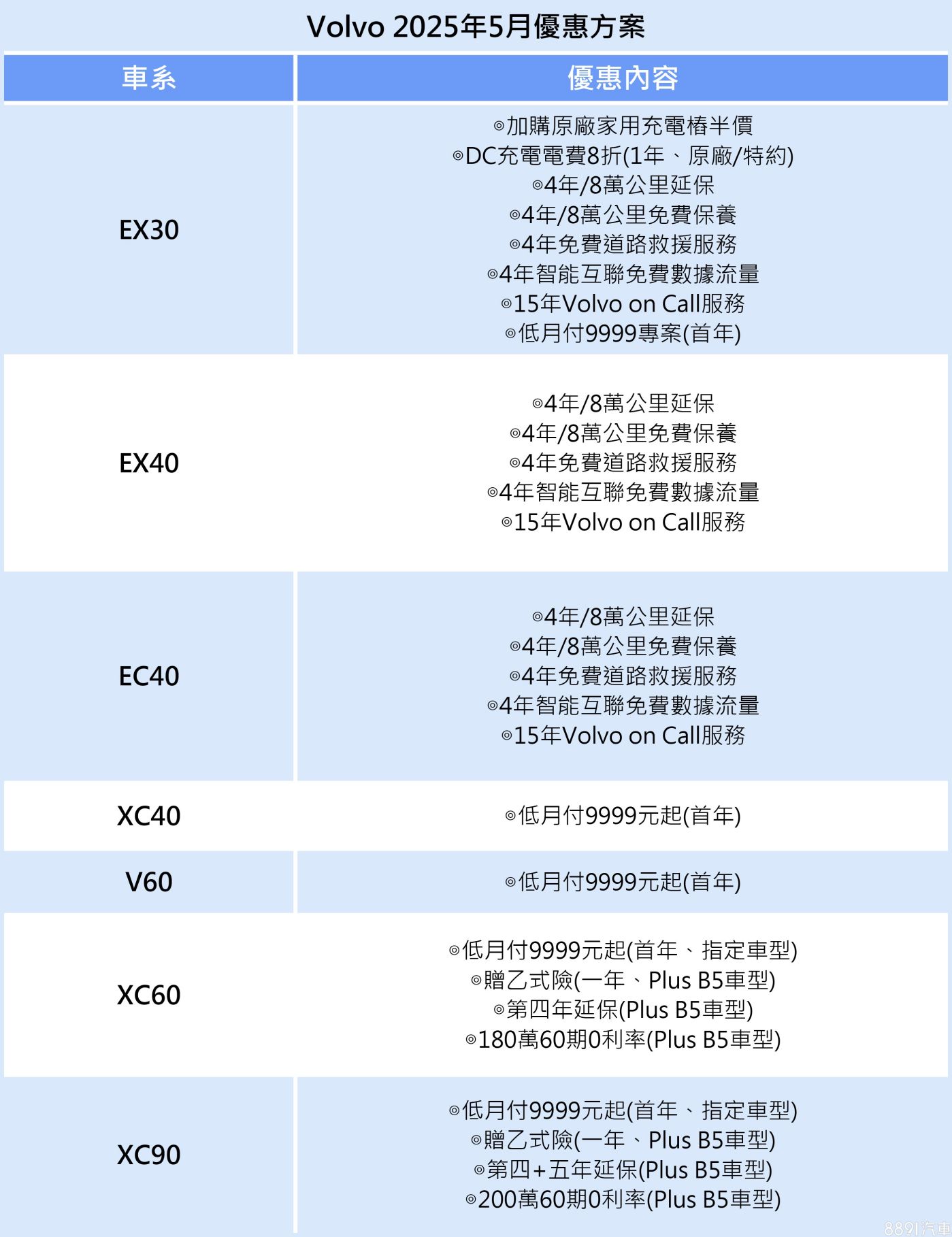 Volvo自5/1至5/31止,針對旗下多數車系持續推出低月付優貸方案,純電車款方面,除了延保、免費保養、免費道路救援服務、智能互聯免費數據流量、Volvo on Call服務等好康,針對EX40和EC40,更推出10萬充電金的限量優惠方案!