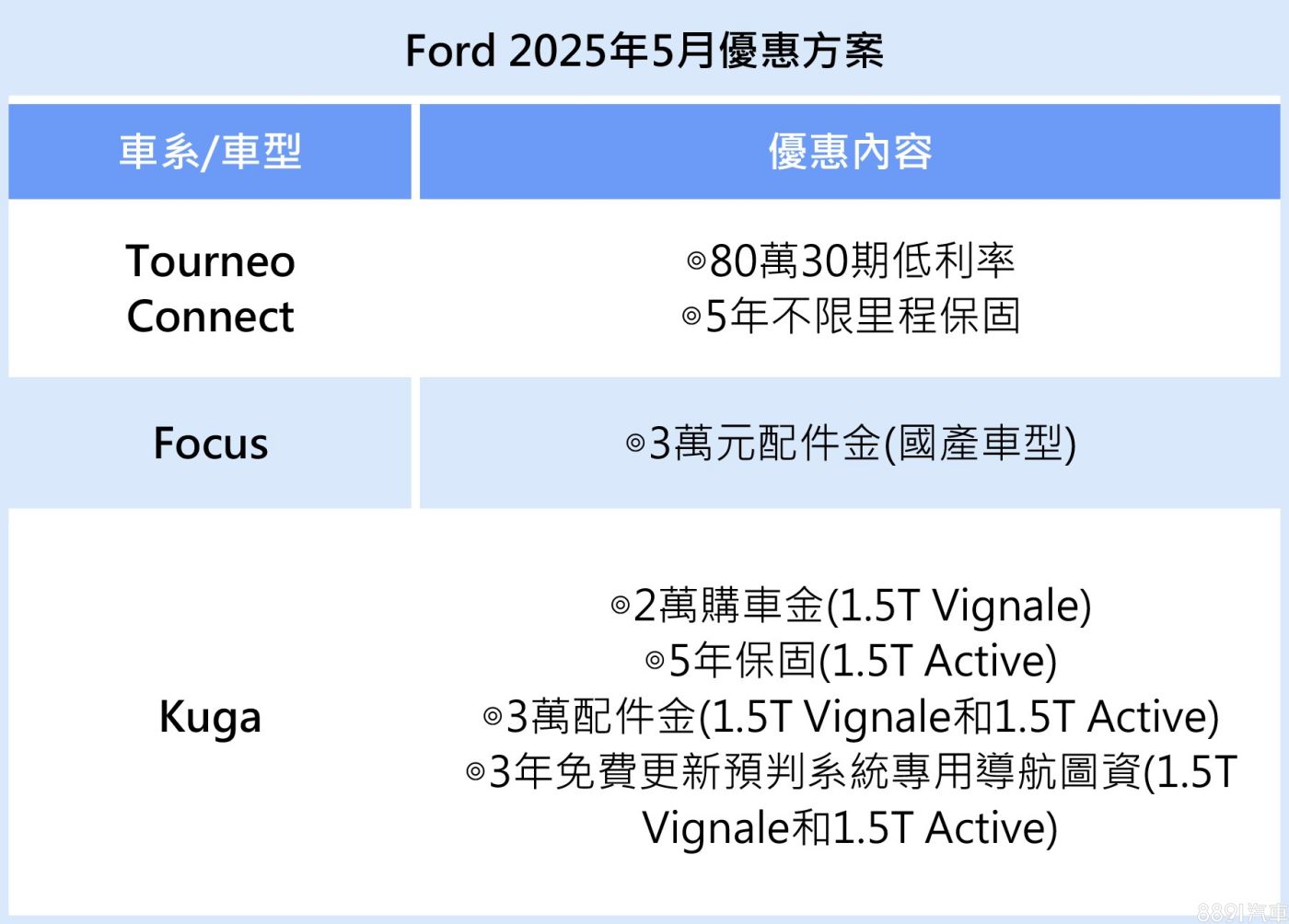 即日起至2025年5月29日止,只要入主Focus全車系贈3萬配件金;Kuga指定車型享6萬豪禮及5年原廠保固;Tourneo Connect旅玩家則享80萬30期低利率,以及5年不限里程原廠保固。