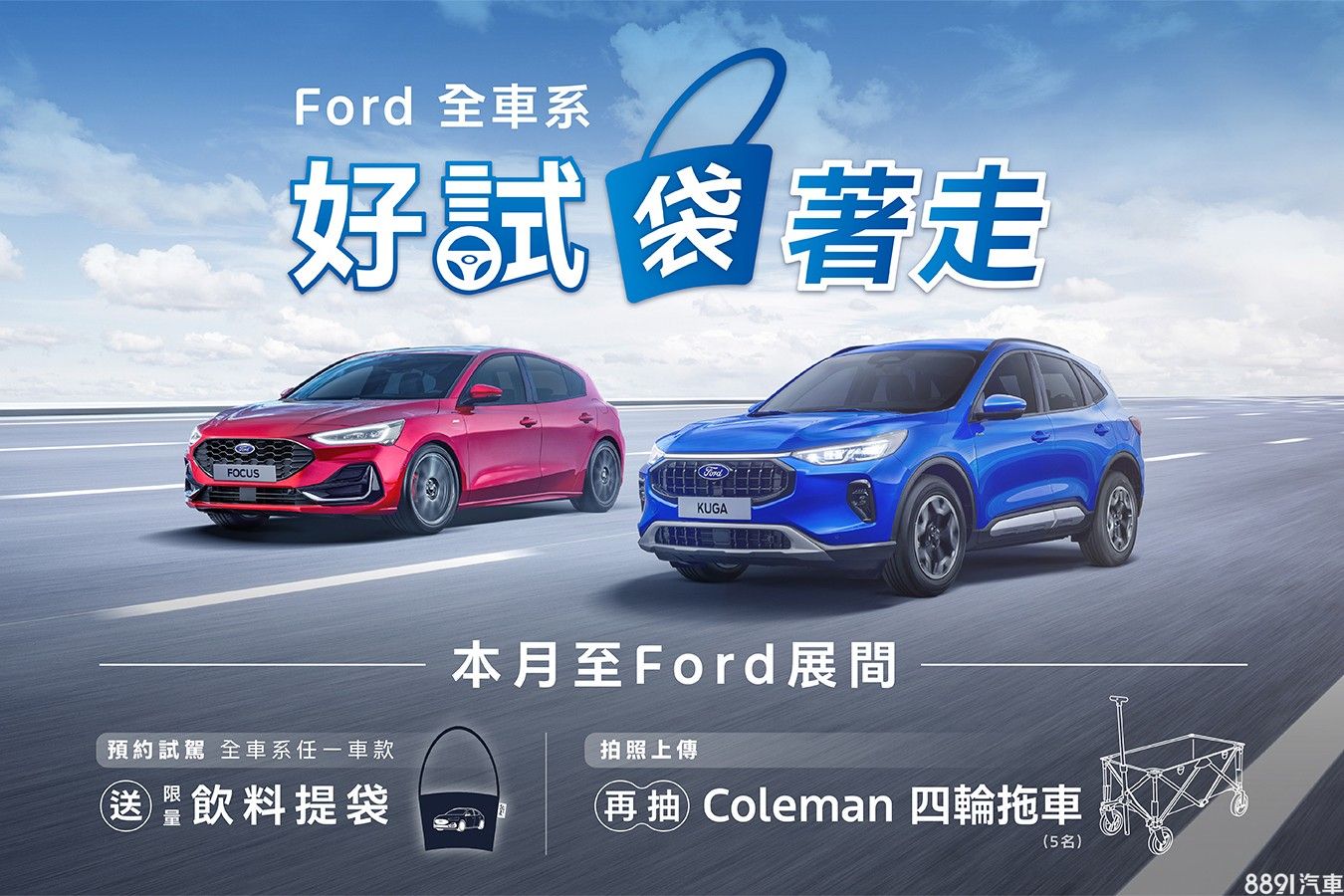 此外,凡至全台Ford展示中心試駕全車系,即可獲得Ford限量專屬飲料提袋,於展間拍照上傳還可再抽Coleman四輪拖車,詳情可洽各地展間與官網查詢。