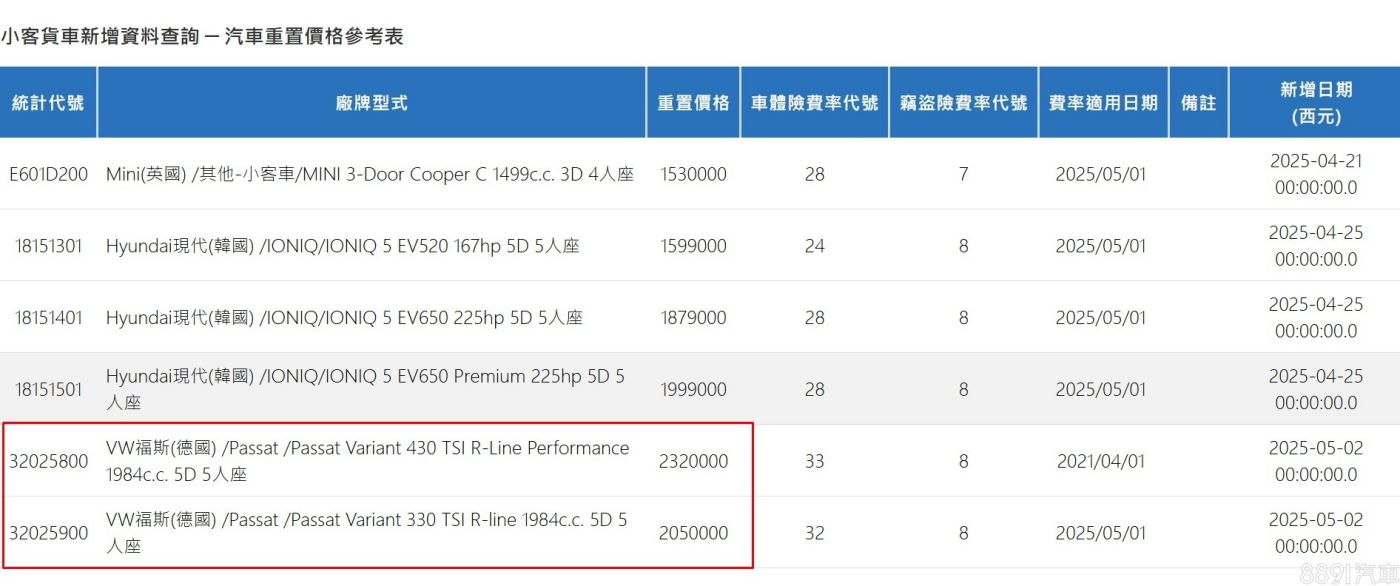 新一代Passat即將重返台灣市場,國內預告5/22發表,然而搶在開賣前,財團法人保險事業發展中心(下稱保發中心),已率先將Passat登錄在汽車重置價格參考表中,並透露入門款售價恐怕就要破「2字頭」!