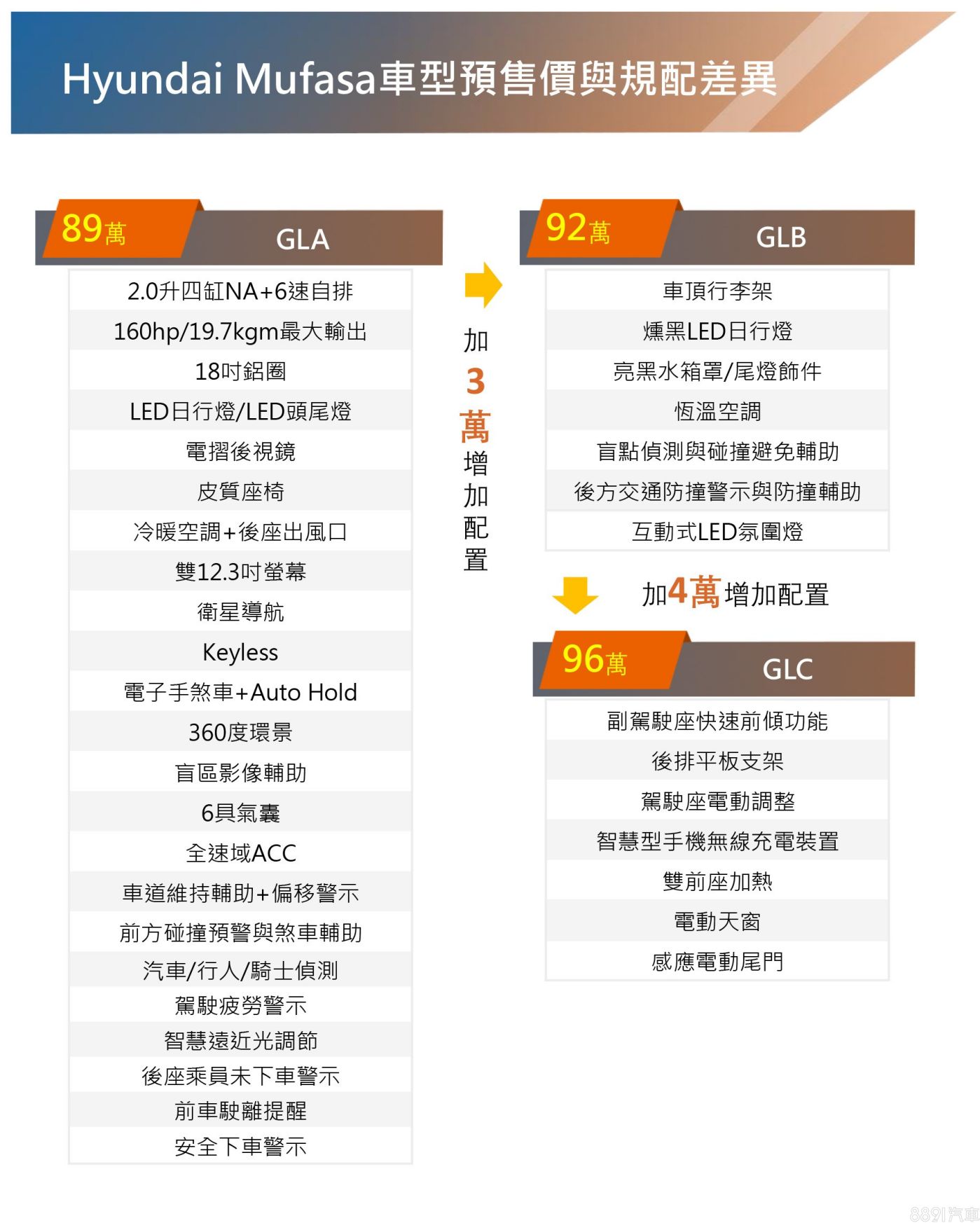 Mufasa提供GLA、GLB、GLC三車型,預售價分別為89、92和96萬元,新車尺碼為4465x1870x1695mm,軸距2680mm,定位於Tucson之下,主打中小休旅市場,由其編成設定來看,入門其實配備就相當豐富,且導入不少品牌世代新科技,二階車型配置最為實用,頂規多為便利與機能性配備,只需加4萬就能獲得物超所值的享受。預計這周末就能在展間看到實車,正式發表則會在5/14。