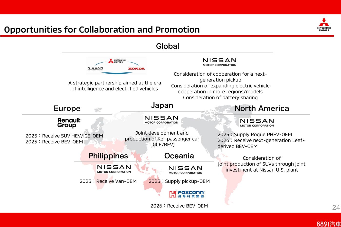 好比,一款Renault電動車今年就會掛上三菱標,於歐洲市場銷售;原廠也計劃打造Nissan Leaf雙生車,向北美市場供應。至於日前與品牌簽署合作意向書的鴻海,若後續完成簽署正式契約,最快自2026年起,由鴻海代工的Model B電動小休旅,便有望以Mitsubishi品牌之名,於大洋洲地區率先開賣。
