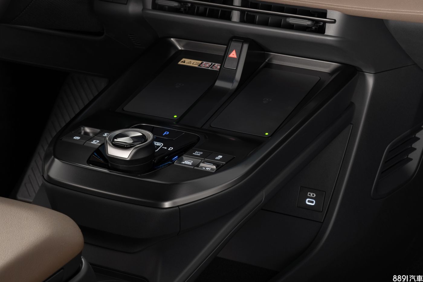 旋鈕式排檔、電子手煞車、360環景攝影機、行車模式等實體按鍵,都整合於懸浮式中船上,前方還有2組手機無線充電板。