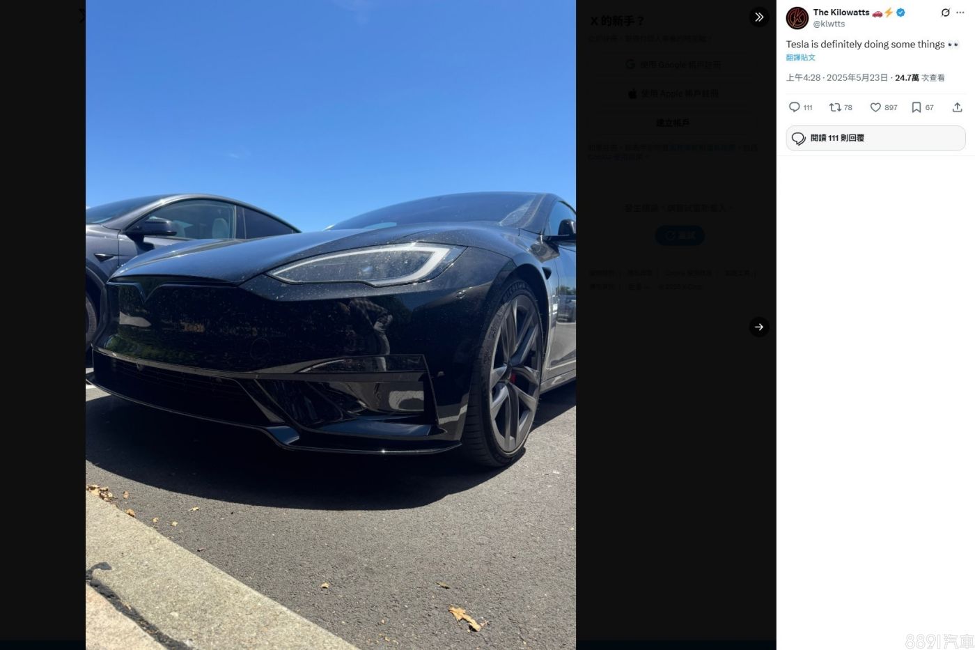 日前外媒才直擊新款Tesla Model S Plaid偽裝車在紐柏林賽道做測試,近日國外社群就有人「無偽裝」捕獲。新車外表僅微整形,首先車頭修改前保桿,下方添加擾流板,強化空力效果,並新增前保桿攝影機,用於提升FSD自動駕駛輔助的環境感知能力,頭燈與日行燈似乎未動刀。(圖片來源X The Kilowatts)