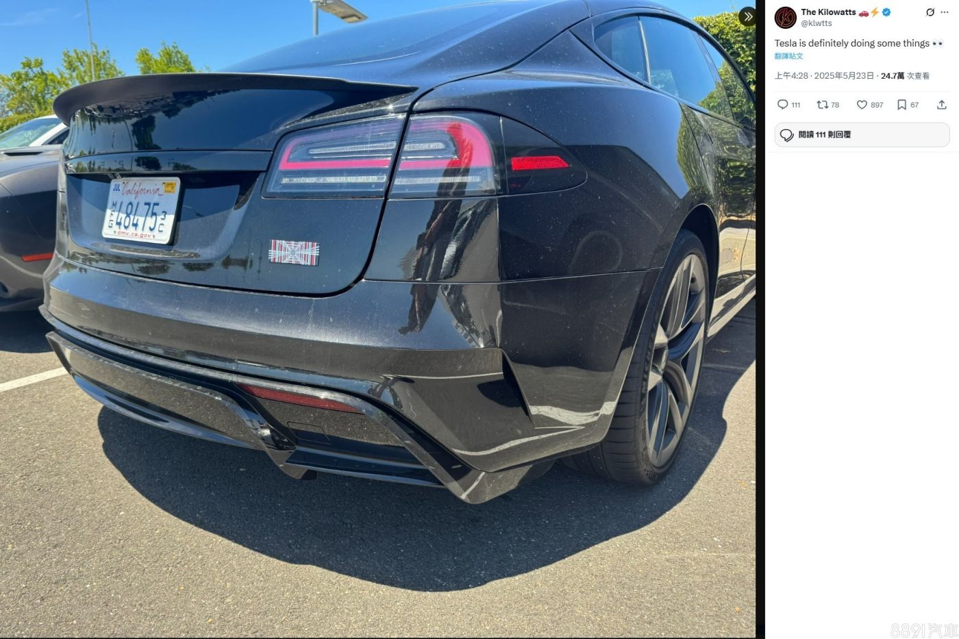 Model S Plaid換上新設計的21吋鋁圈,造型更加動感之餘,也可預期有針對空氣力學做精進,藉此優化純電行駛里程。車尾也是大致維持原有造型,僅針對後保桿翻新,並加入更具張力的分流器設計。(圖片來源X The Kilowatts)