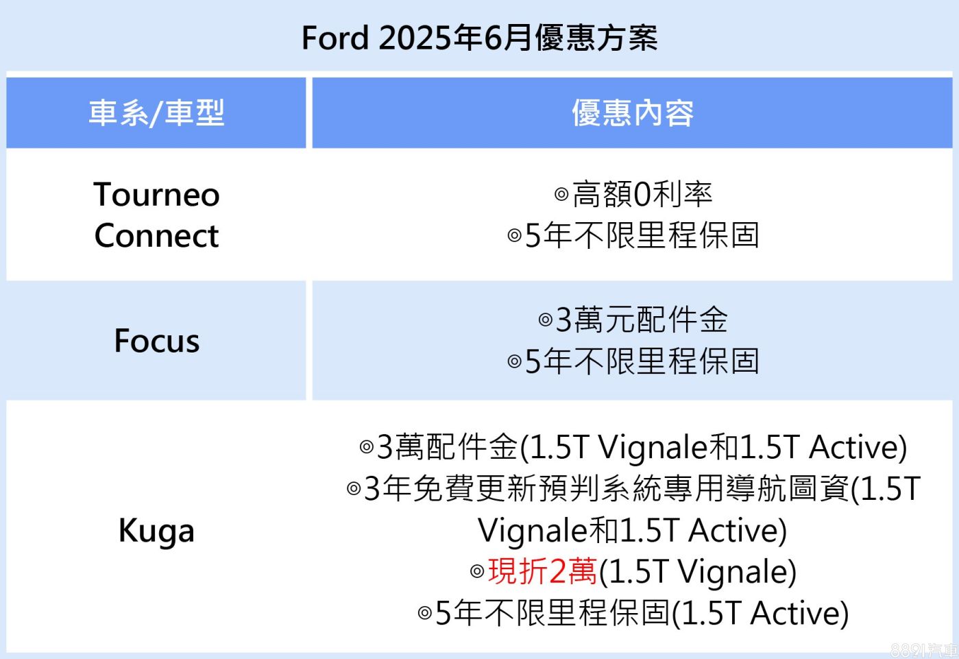 此外,活動期間只要入主國產車系,還能抽百萬黃金車牌!全車系各車型也有不同優惠,Kuga1.5T指定車型享大方送6萬豪禮及5年不限里程原廠保固,入門款還贈2萬購車金;Focus全車系送3萬元配件金,以及5年不限里程原廠保固; Tourneo Connect旅玩家享高額0利率,加碼5年不限里程原廠保固。馬上獲取新車分期方案>>