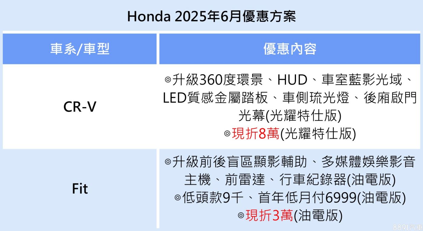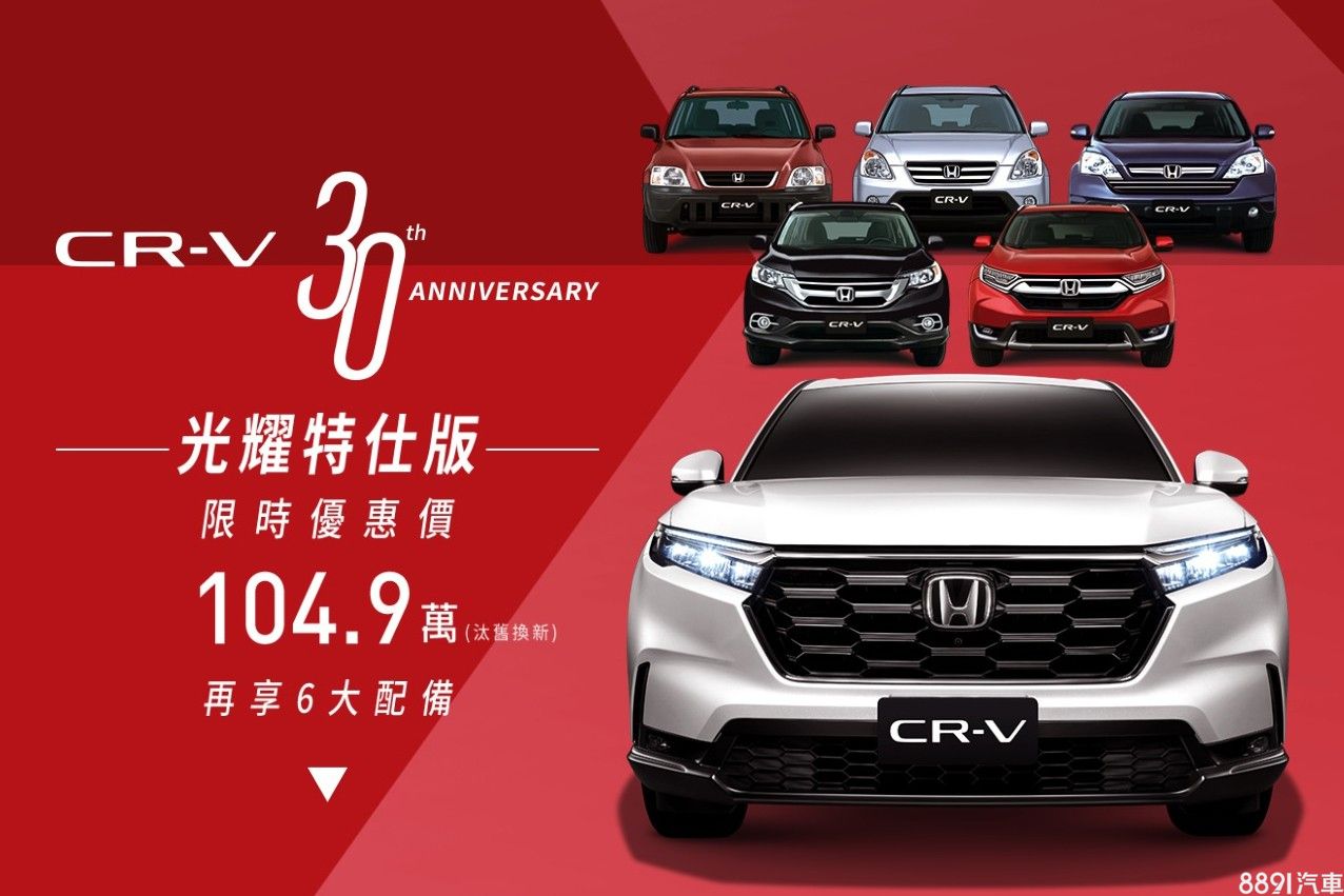 本田CR-V本月推出光耀特仕版,以售價117.9萬的S車型為基礎,免費升級360度環景、HUD、車室藍影光域、LED質感金屬踏板、車側琉光燈、後廂啟門光幕等六項配備,並開出109.9萬的價格,等於現折8萬!一鍵試駕,立即體驗>>